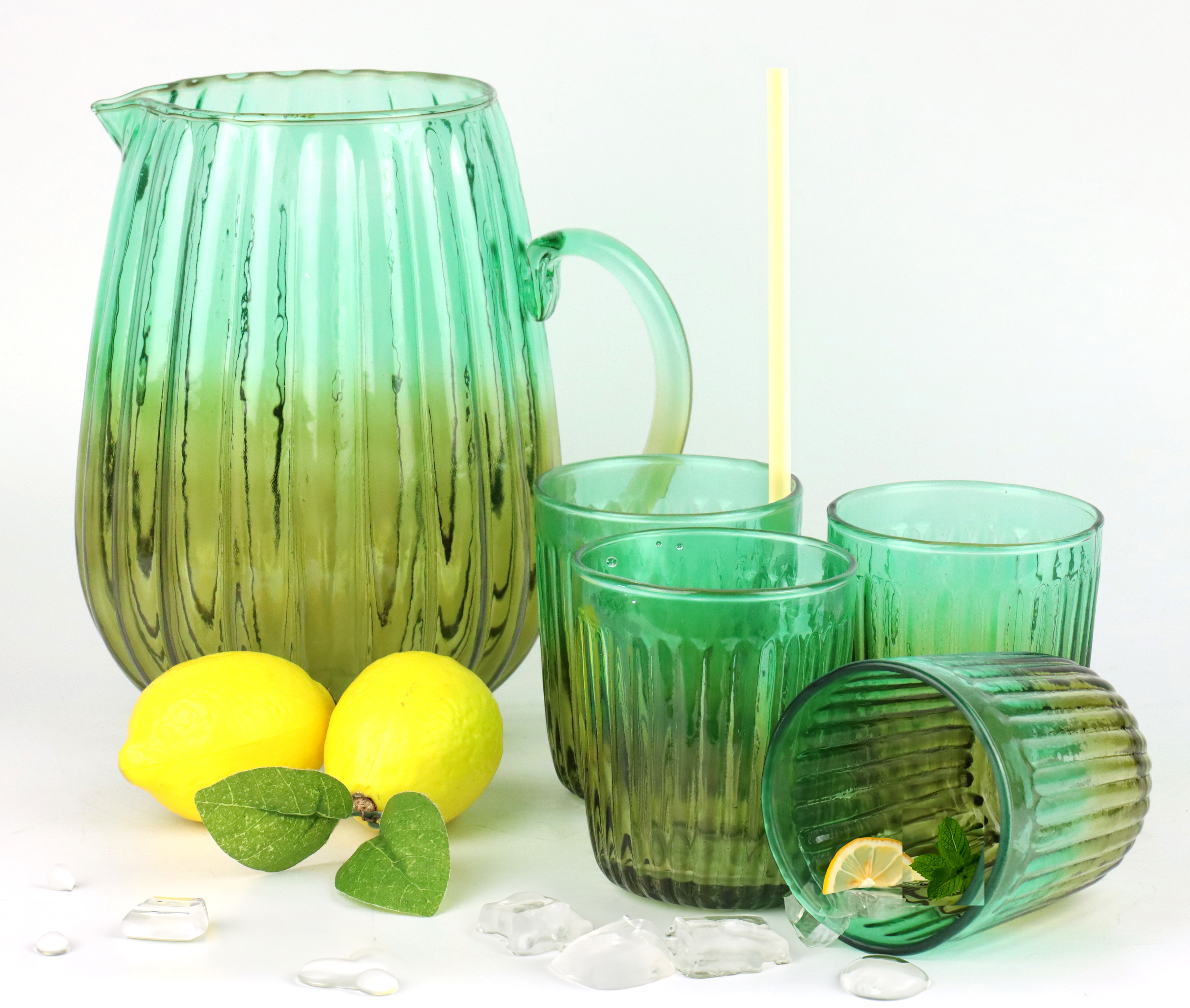 Mit dem Karaffenset "Green Harmony" können Ihre Kunden stilvoll Getränke servieren - ob erfrischendes Wasser, frisch gepresste Säfte oder edle Weine. Die Karaffe hat ein großzügiges Fassungsvermögen, während die Gläser handlich und doch großzügig genug sind, um jedem Getränk den nötigen Raum zu geben. Dies macht das Set ideal für den Einsatz zu Hause, bei Dinnerpartys oder für besondere Anlässe, die ein elegantes Ambiente erfordern.