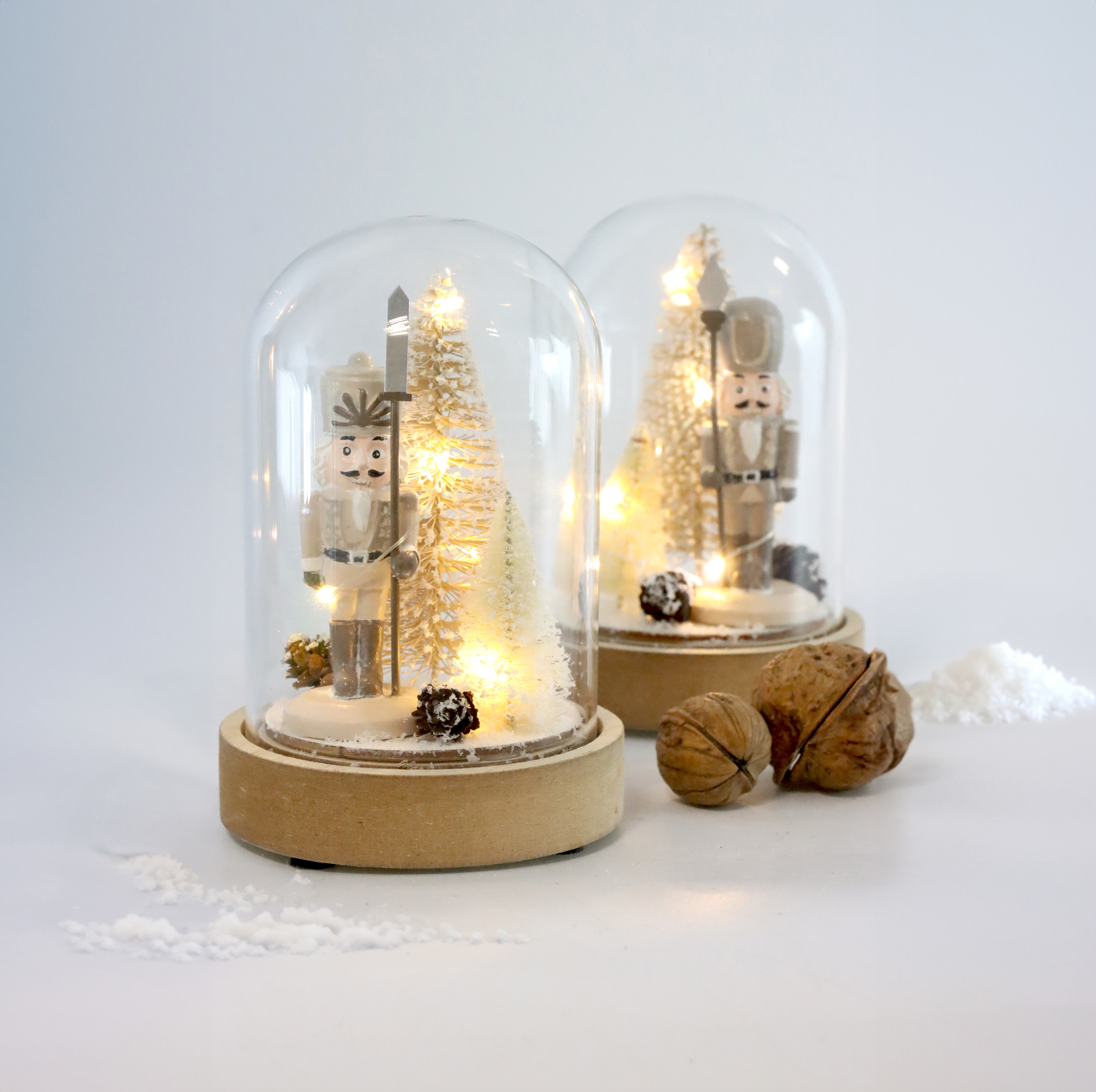 Die Glocken strahlen dank der modernen LED-Technologie ein warmes und einladendes Licht aus. Sie sind batteriebetrieben und können daher flexibel zur Gestaltung der Schaufenster, Regale und Verkaufsstellen eingesetzt werden. Die schimmernden LED-Lichter bringen den nostalgischen Nussknacker aus Holz und Glas, mit einer Höhe von etwa 14 cm, zum Leuchten.