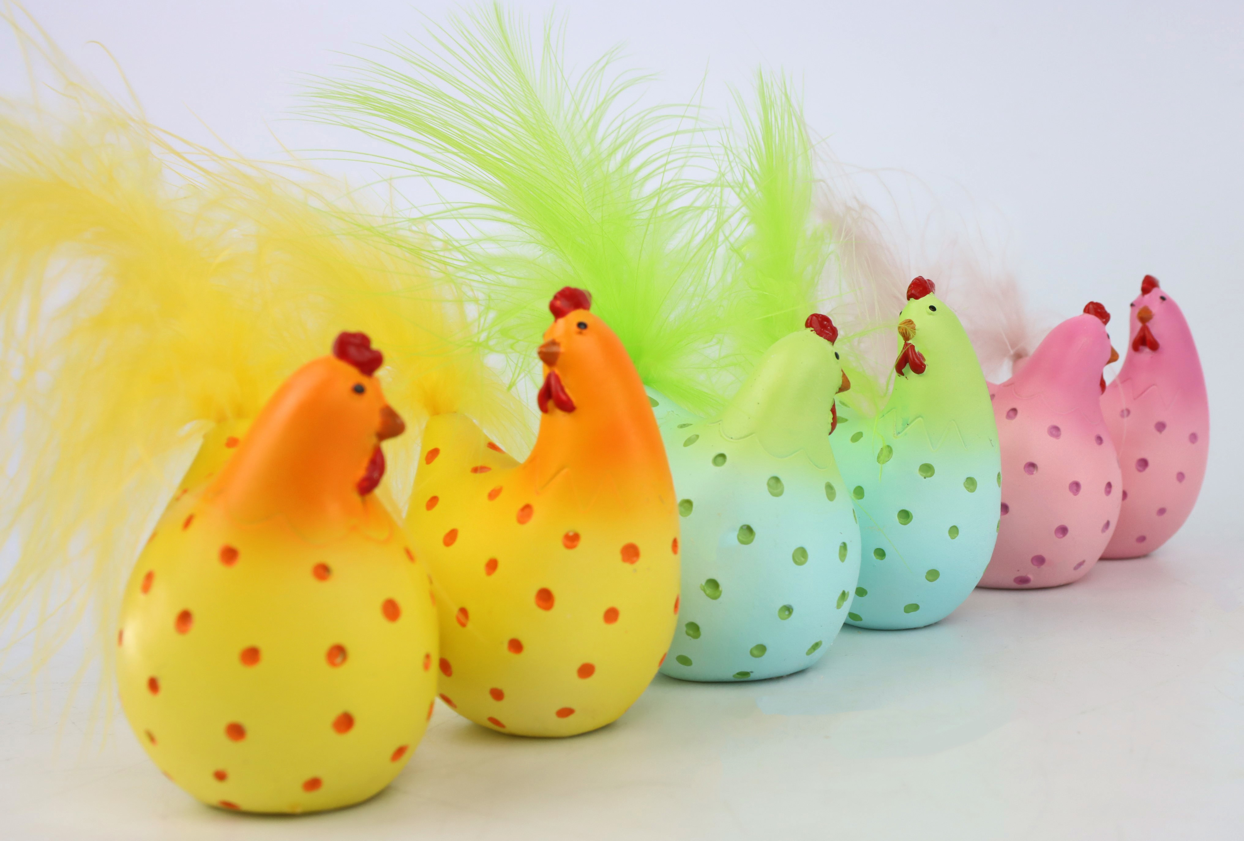Diese entzückenden Hühner sind speziell für die Osterzeit gestaltet, strahlen jedoch eine zeitlose Niedlichkeit aus, die sich auch über die Feiertage hinaus bemerkbar macht. Jedes Huhn ist liebevoll mit verspielten Punkten verziert, was dem Gesamtbild eine einzigartige Textur und ein charmantes Erscheinungsbild verleiht. Diese Hühner im fröhlichen Design verleihen jeder Umgebung eine gewisse Frische und heben die Laune Ihrer Kunden.