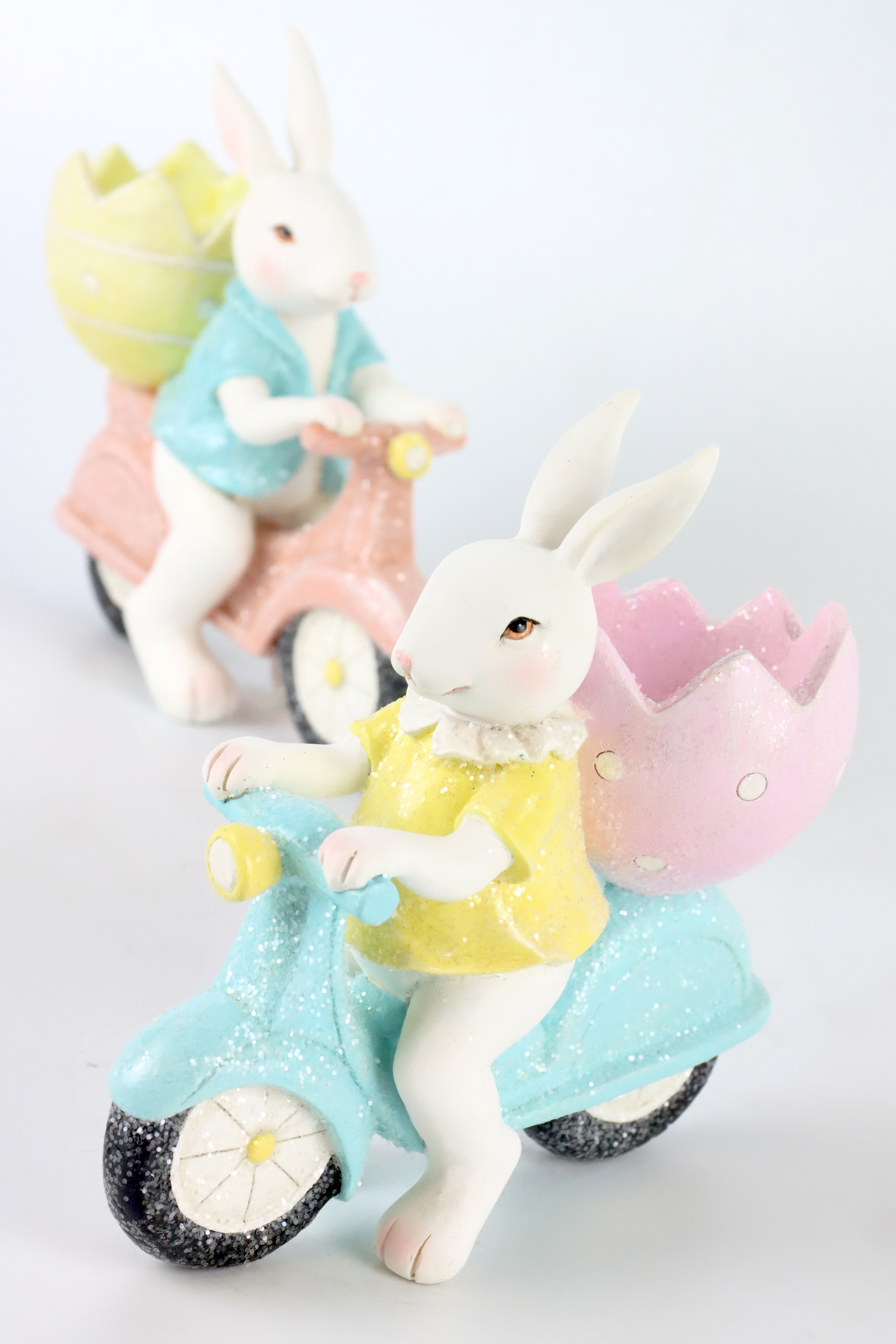 Da die Nachfrage nach individuellen und thematisch passenden Dekorationen insbesondere zur Osterzeit kontinuierlich wächst, ist dieses Set eine wunderbare Ergänzung für Ihr Sortiment. Ihre Kunden werden die kreativen und charmanten Attribute dieser Hasenfiguren zu schätzen wissen, die auf Rollern sitzend durch die Frühlingssaison fahren. Diese lebendigen und unverwechselbaren Stücke sprechen vor allem Käufer an, die nach einzigartigen Deko-Elementen suchen, um ihr Zuhause aufzuwerten.