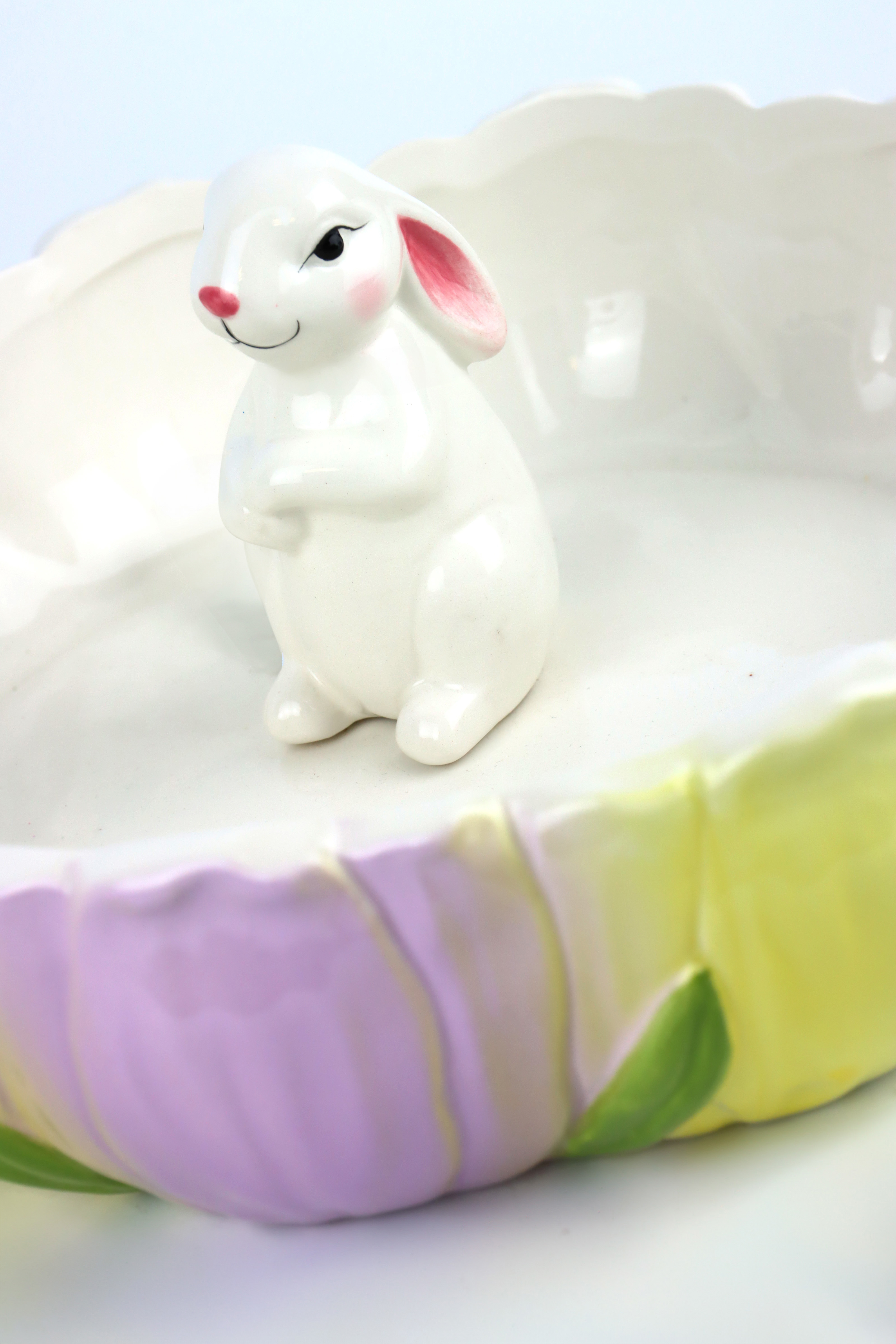 Hergestellt aus hochwertiger Keramik, vereint die Schale "FLOWER BUNNY" eine robuste Qualität mit einem charmanten Design, das den Osterzauber in jedes Zuhause bringt. Die Detailgenauigkeit der Hasenabbildung und die feinen floralen Elemente sorgen für ein harmonisches Gesamtbild, das in keinem Wohnambiente fehlen sollte. Das Produkt passt ideal in den Bereich Wohnen und Lifestyle, und bietet Ihren Geschäftspartnern das perfekte Accessoire für ihre Osterdekorationen.
