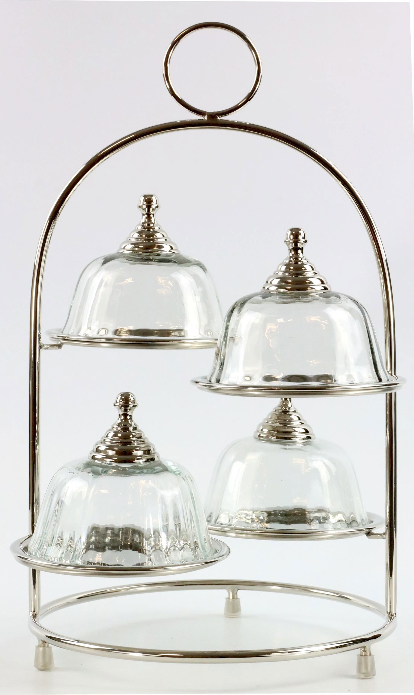 Discover the exquisite "TABLE" serving ensemble (item number: 9076), which has been specially developed for the discerning stationary retail sector in the home and lifestyle segment. This two-tier serving ensemble impresses with its elegant silver accents and proves to be an irresistible eye-catcher on any table setting. The ensemble includes four elegant bells that add a special touch of sophistication and style to your arrangement. It is therefore not only a functional tool, but also a luxurious decorative element that will delight your customers.