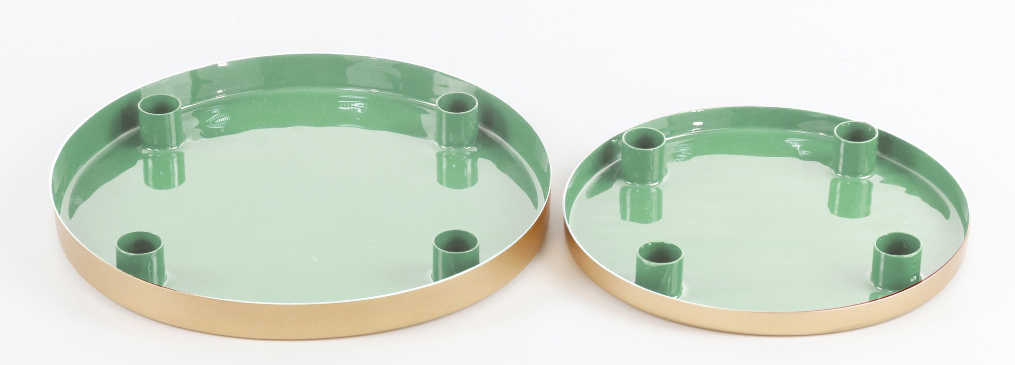 Our "Deluxe" candle bowls (item number: 7999) consist of two candle bowls in the charming colour mint. The bowls are made of high-quality metal, which not only makes them robust and durable, but also a real eye-catcher on any glass table or sideboard. They have a diameter of 25 cm and 20 cm, which makes them perfect for four stick candles and guarantees an elegant and stylish look.