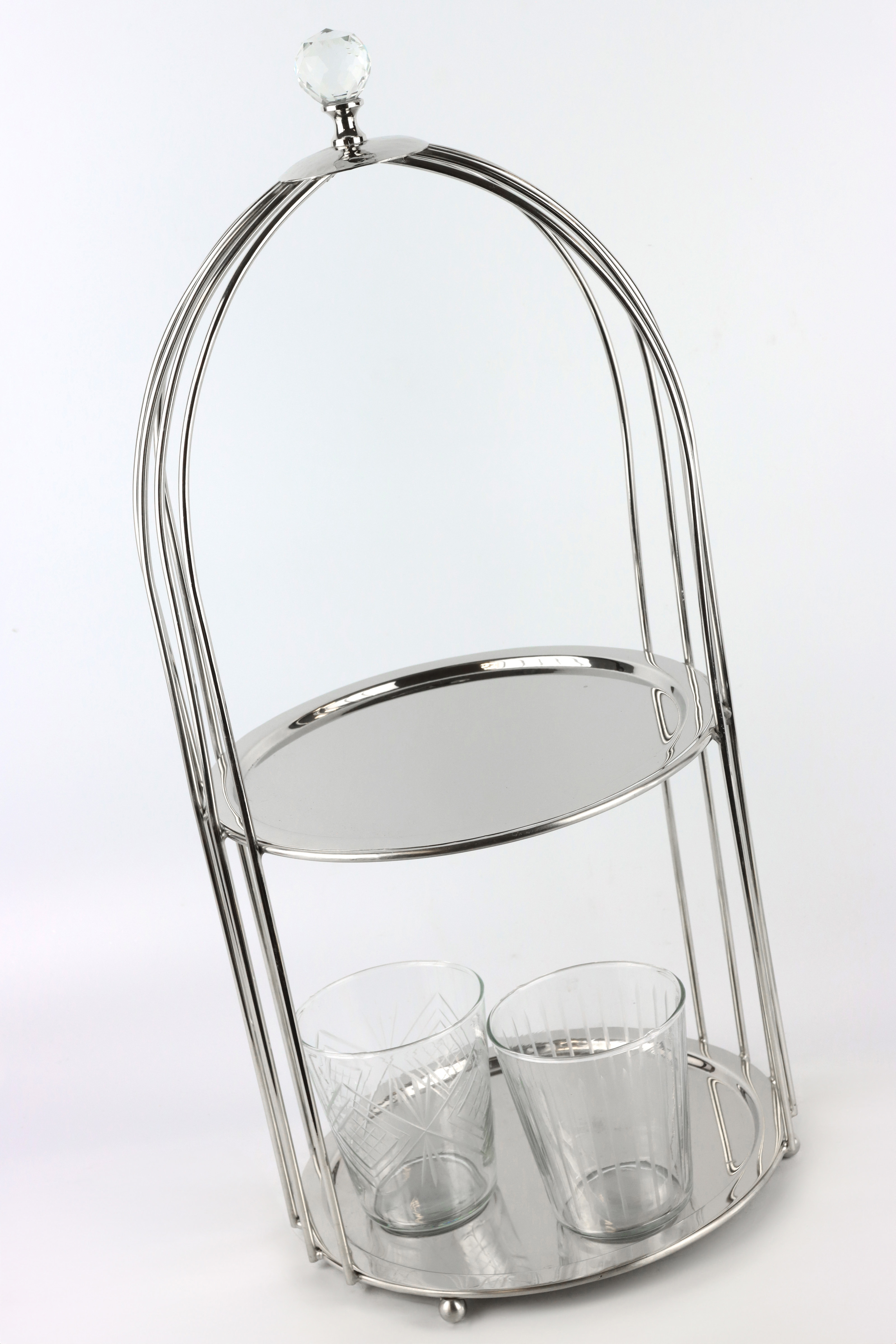 With its round, two-tier design, the ETAGERE "CAGE" offers a wide range of possible uses. Whether for the stylish presentation of pastries, fruit or festive arrangements - this etagere will add a special touch to your product range. Its classic silver finish lends any room a timeless elegance, while the sophisticated design guarantees stability and durability.