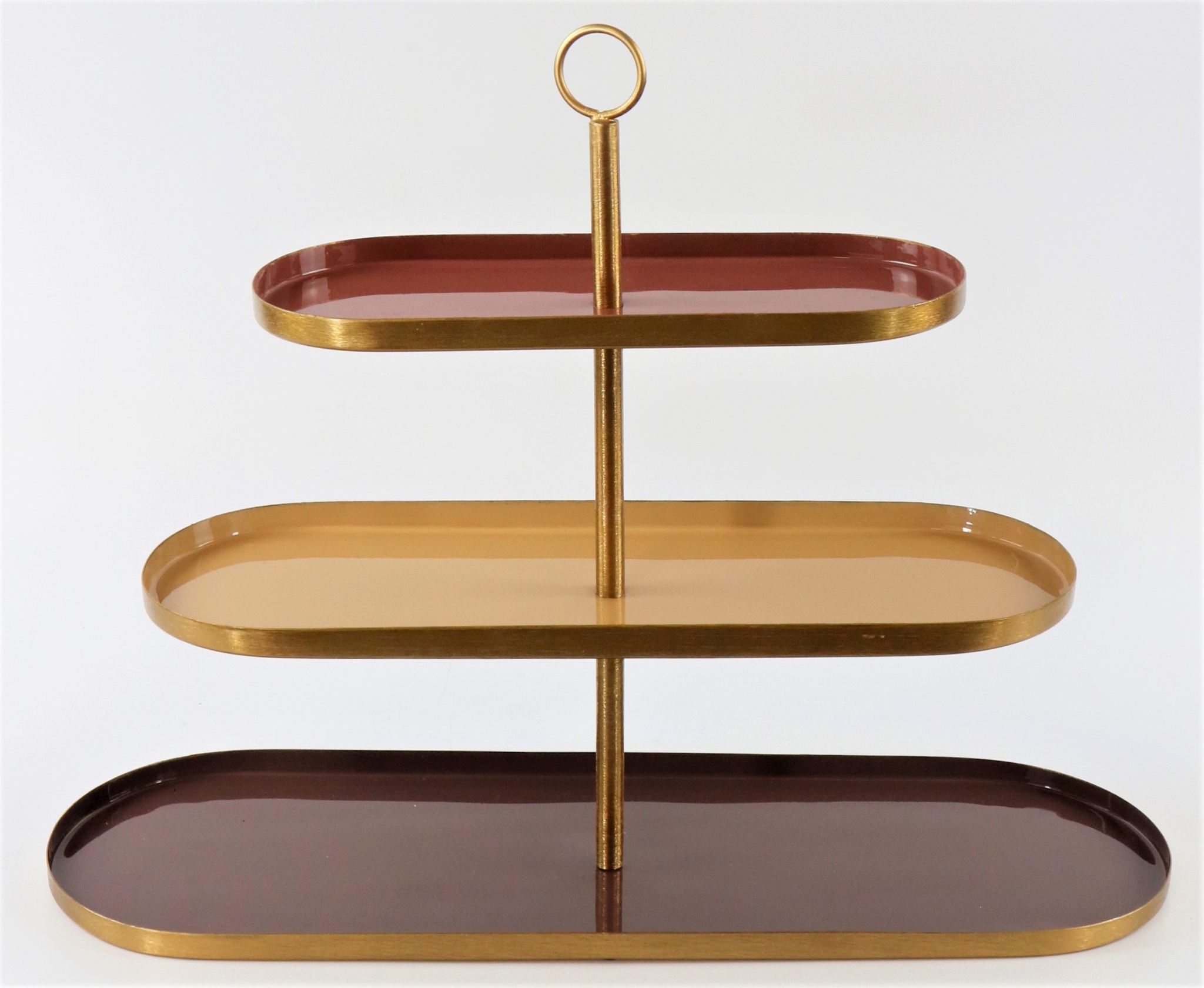 Descubra la encantadora elegancia de la "ETAGERE DELUXE", una joya ovalada de tres pisos que no puede faltar en ningún ambiente amueblado con estilo. Especialmente diseñada para la venta al por menor en el sector del hogar y el estilo de vida, esta etagere combina una estética atemporal con una funcionalidad práctica. Con una impresionante altura de unos 51 cm y un elegante acabado marrón de metal robusto, es la elección ideal para los minoristas que desean ofrecer a sus clientes no sólo funcionalidad, sino también un toque de lujo.
