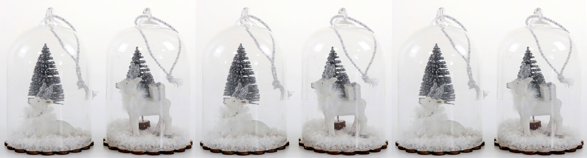 ESEste precioso juego de seis campanillas de cristal con motivo de reno (n.º de artículo: 9258) es el complemento perfecto para cualquier decoración navideña en salones y espacios de ocio. Con su detallado acabado en blanco hecho de poliresina resistente y cristal robusto, estas campanas de cristal crean una sensación de país de las maravillas invernal y evocan un ambiente navideño en cualquier habitación.