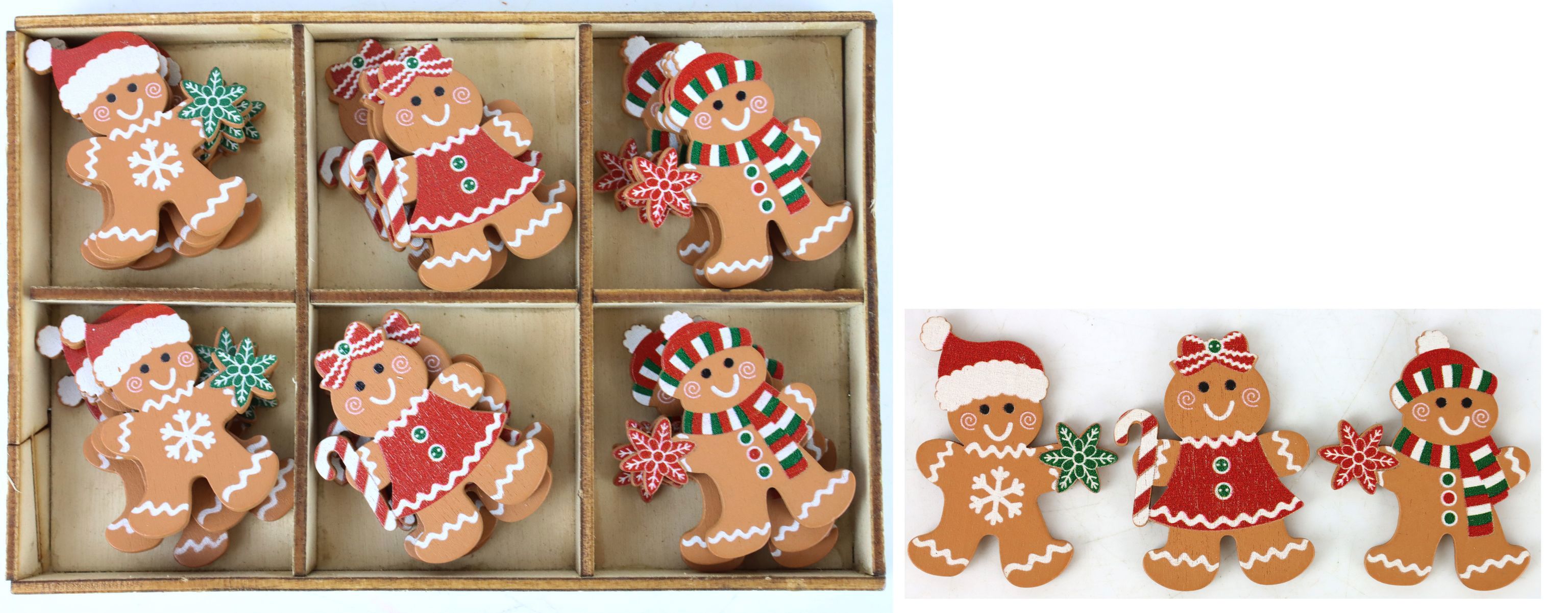 Un aspecto clave de nuestra CAJA DE MADERA "HOMBRE DE JENGIBRE" es su calidad y atención al detalle. Este juego de 24 piezas no sólo es único, sino también robusto y sostenible. Esto las convierte en un éxito de ventas en nuestra tienda online. Son imprescindibles para cualquier minorista que desee añadir a su surtido adornos decorativos para el árbol de Navidad y adornos navideños tradicionales de madera.