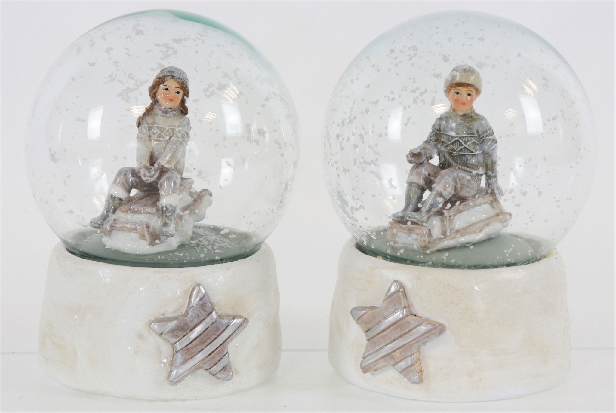 Nuestro juego de dos bolas de nieve "Niños de invierno" es una imagen idílica de un paisaje invernal, un momento de tranquilidad capturado en la magia de una bola de nieve. Fabricadas en poliresina de alta calidad, las bolas de nieve miden 13 cm de alto y son una cuidada representación de niños disfrutando de su mundo invernal. Ponga a usted y a sus clientes en un ambiente de alegría y calidez mientras soplan los fríos vientos invernales.