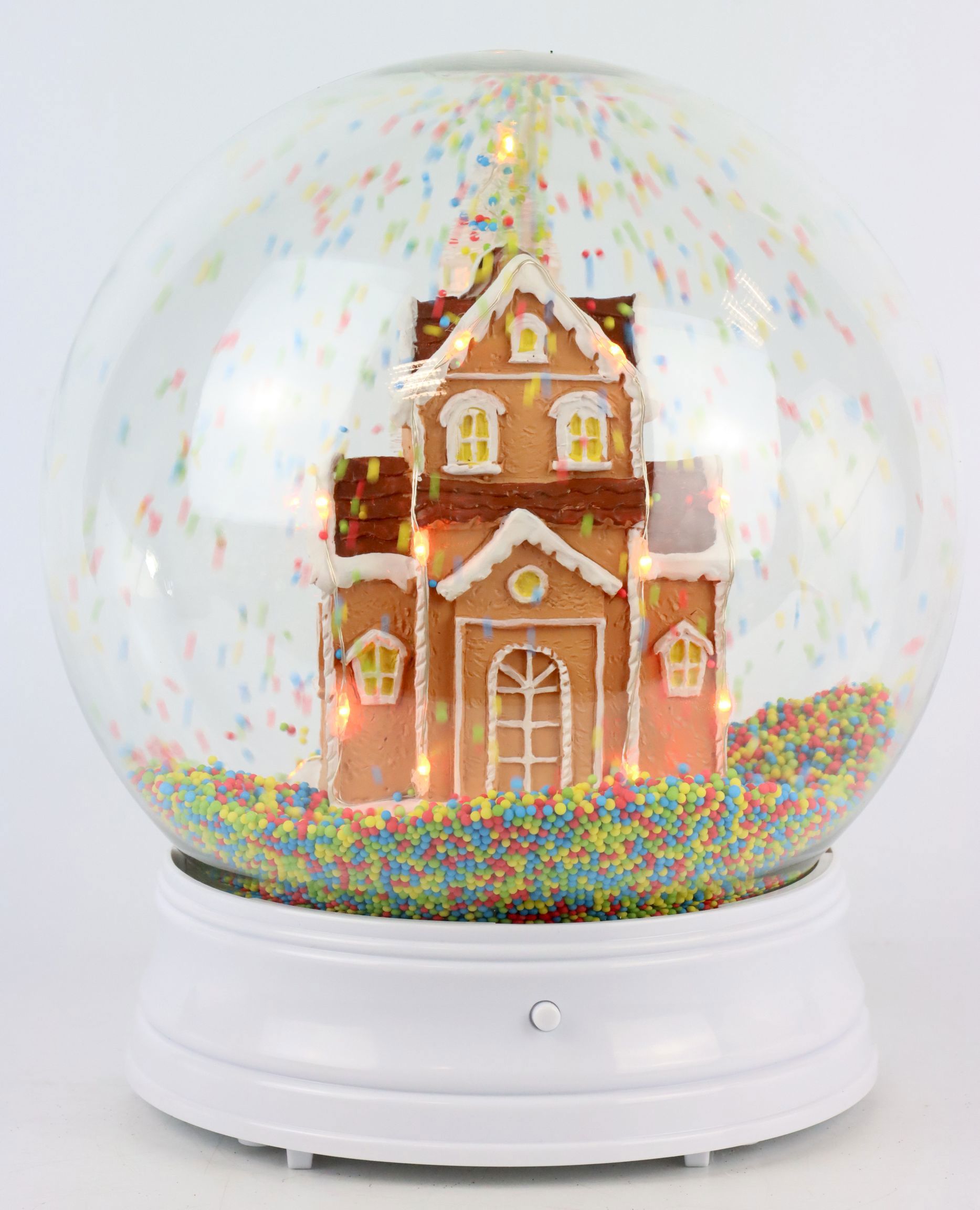 - Descripción: caja de música con casa de pan de jengibre y bola de nieve, de plástico y metal y 25 cm de altura