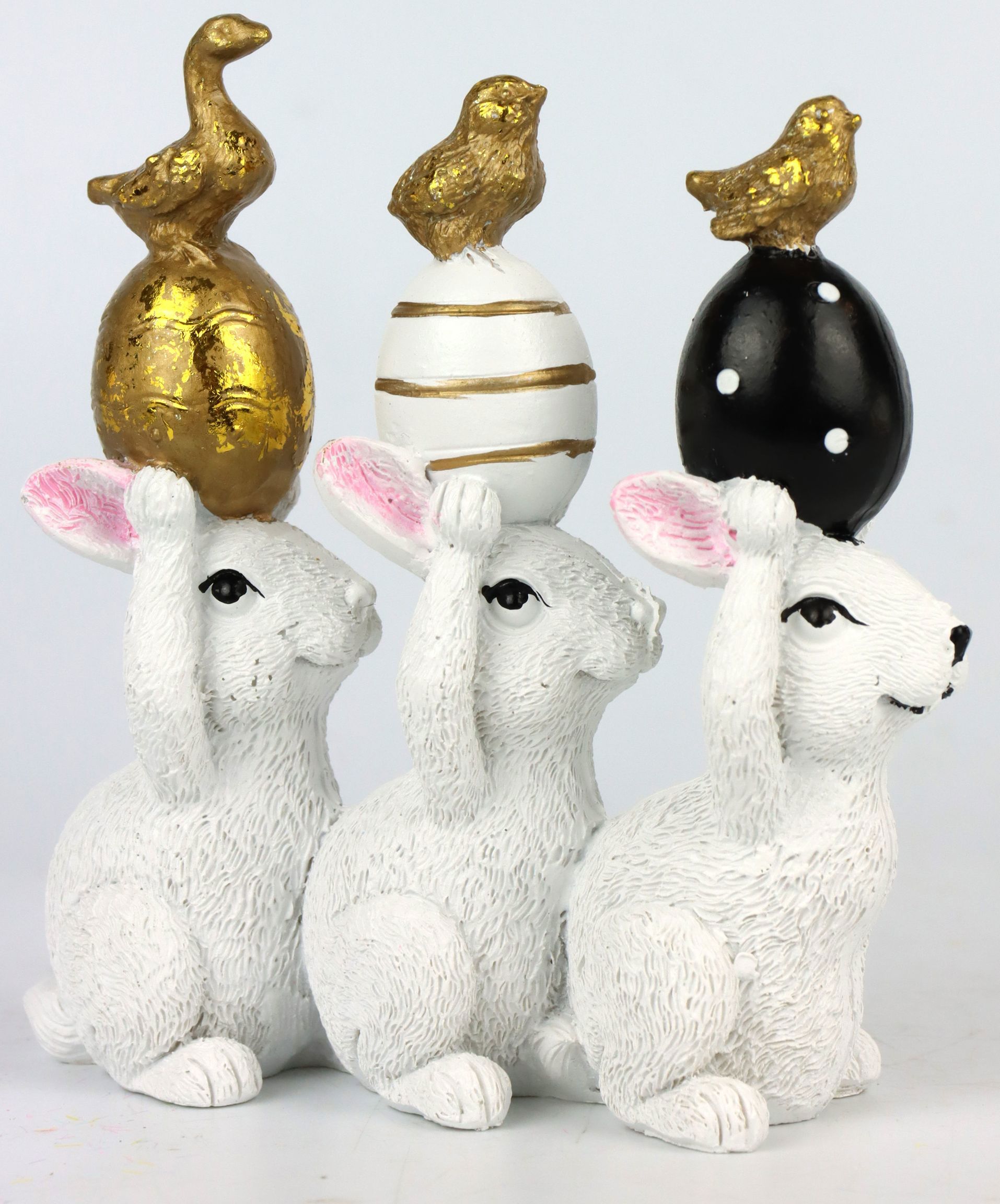 - Set decorativo con tres detallados conejitos de Pascua para zonas de venta primaverales