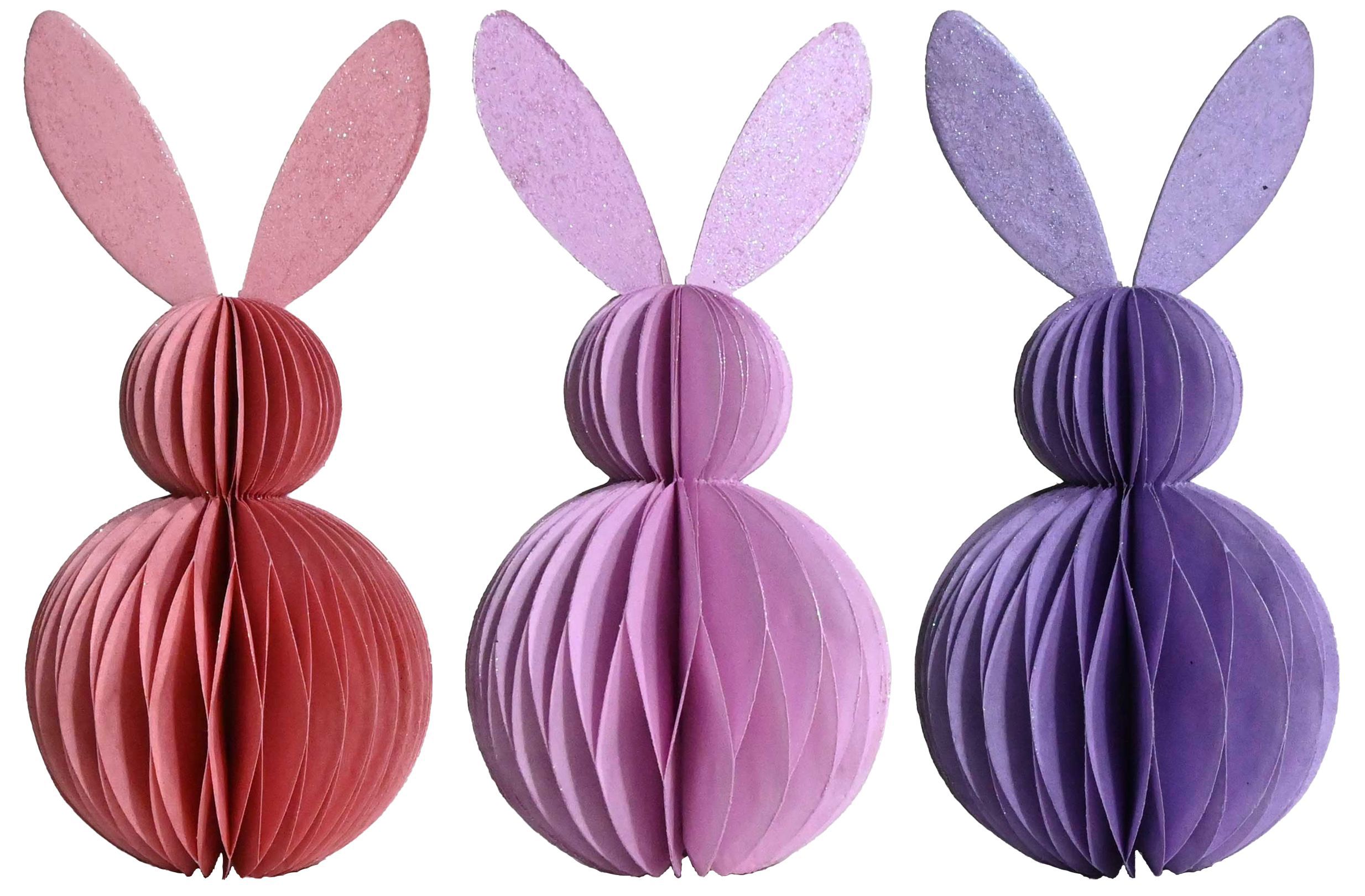 ¡Bienvenido a la primavera! Con nuestro set de conejitos decorativos "Panal", podrá llevar momentos frescos y alegres de Pascua directamente a su tienda. Este elegante set de 3 piezas se compone de detallados conejitos decorativos en suaves tonos morados. Están hechos de papel de alta calidad y miden unos 16 cm de alto cada uno. Estos elegantes adornos de Pascua darán instantáneamente a cualquier habitación un ambiente acogedor y elegante que hará las delicias de sus clientes.