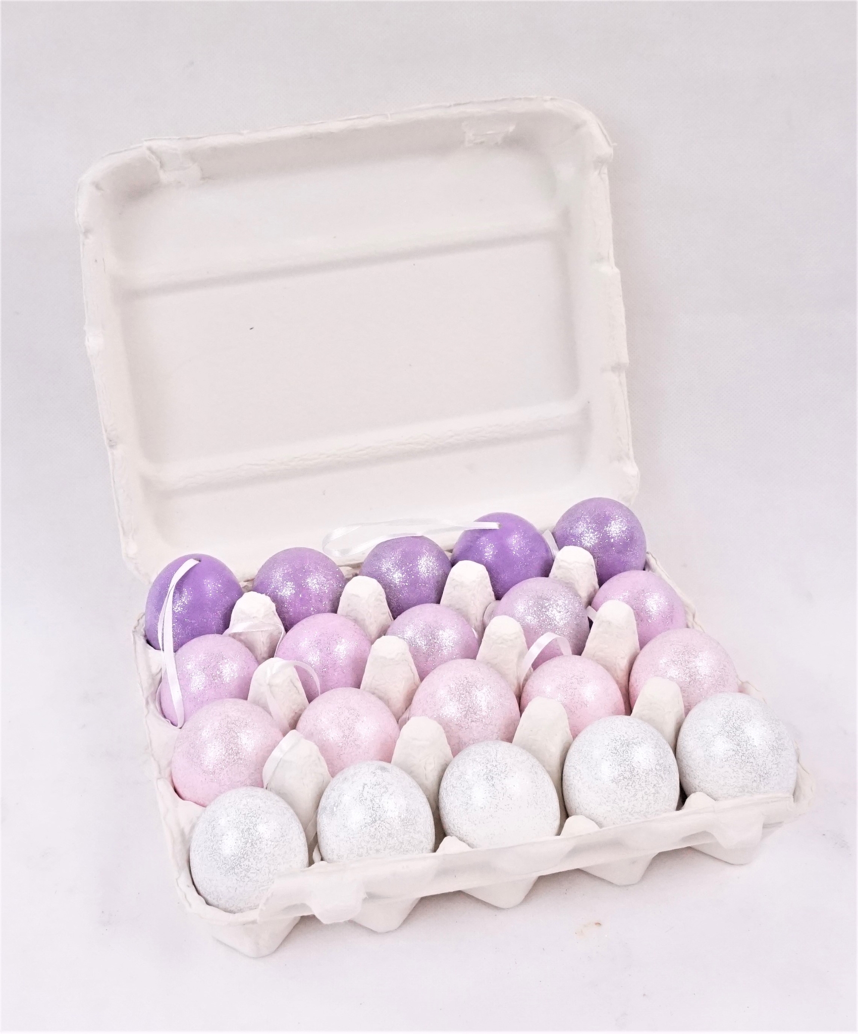 Nuestro DISPLAY DE HUEVOS S/20 "LILA" atrae todas las miradas gracias a sus brillantes colores morados y a la purpurina finamente incorporada. Estos huevos de Pascua son ideales para decorar estanterías, mesas o escaparates, y atraen a los clientes que valoran la decoración moderna pero de alta calidad. Dé a su tienda un toque fresco y estacional que invite a los clientes a quedarse y comprar. Gracias al resistente cartón de huevos de alta calidad, el set es fácil de manejar y transportar.