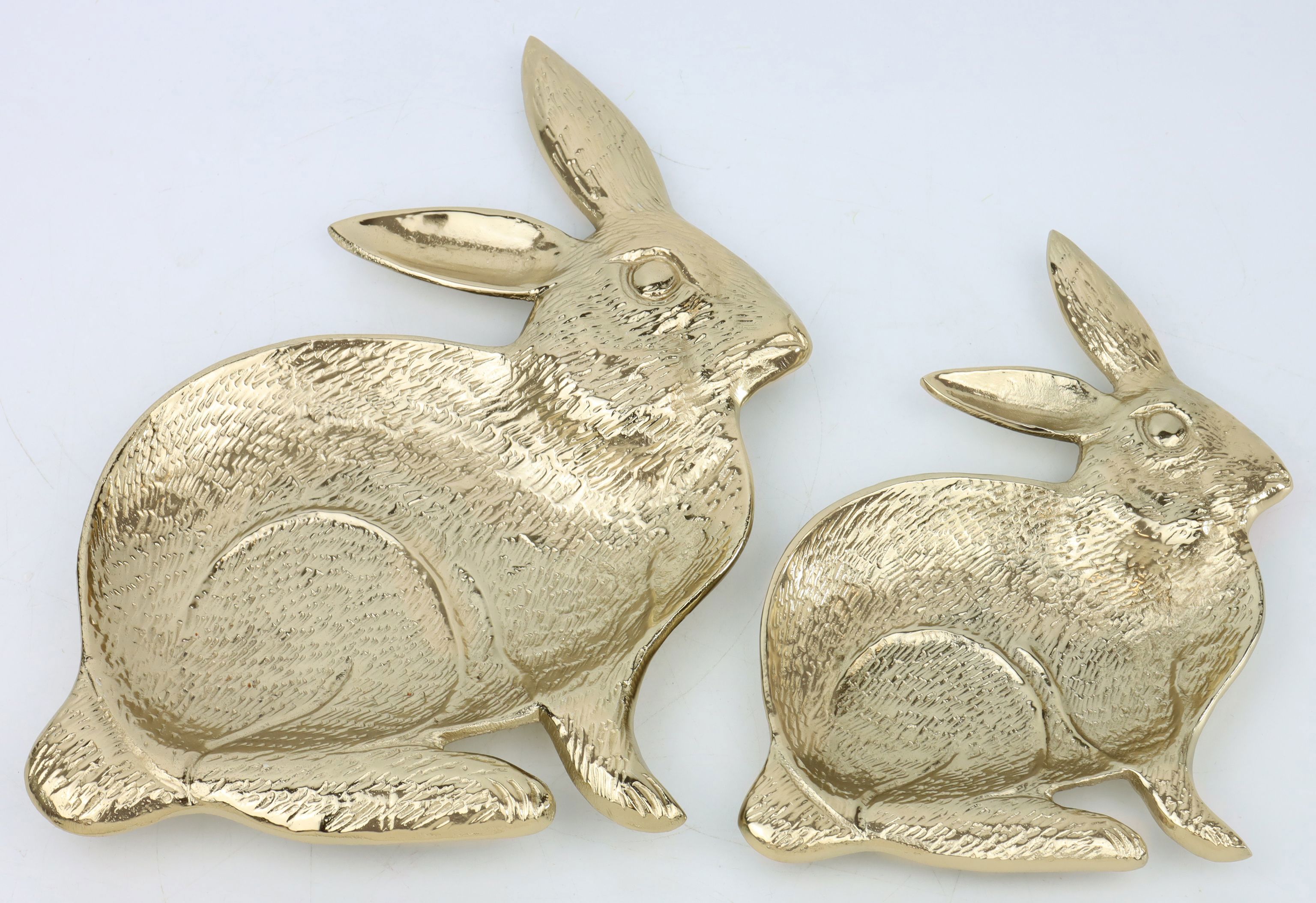 Descubra nuestro elegante juego de platos con forma de conejo, ¡el complemento perfecto para su decoración de Pascua! Estos platos decorativos de aluminio de alta calidad no sólo son prácticos, sino que también llaman la atención en cualquier hogar. Con su elegante acabado dorado y sus detallados motivos de conejitos, aportarán un glamour festivo a la decoración de su mesa. El set consta de dos platos de diferentes tamaños, uno con un diámetro de aprox. 17 cm y otro con un diámetro de aprox. 23 cm, ideales para presentar pequeñas golosinas, galletas de Pascua y artículos decorativos.