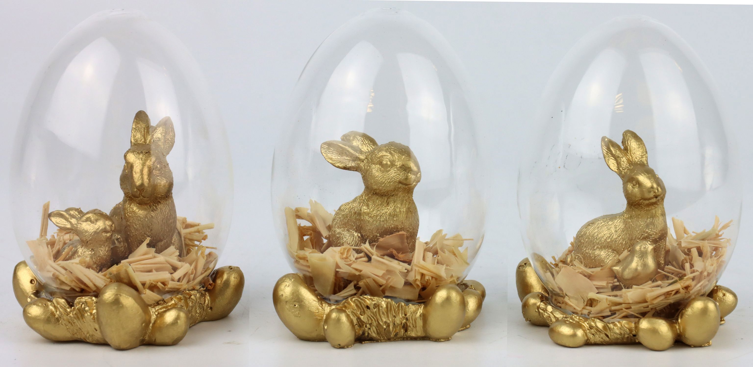 - El juego consta de tres huevos de cristal con un conejito dorado de poliresina