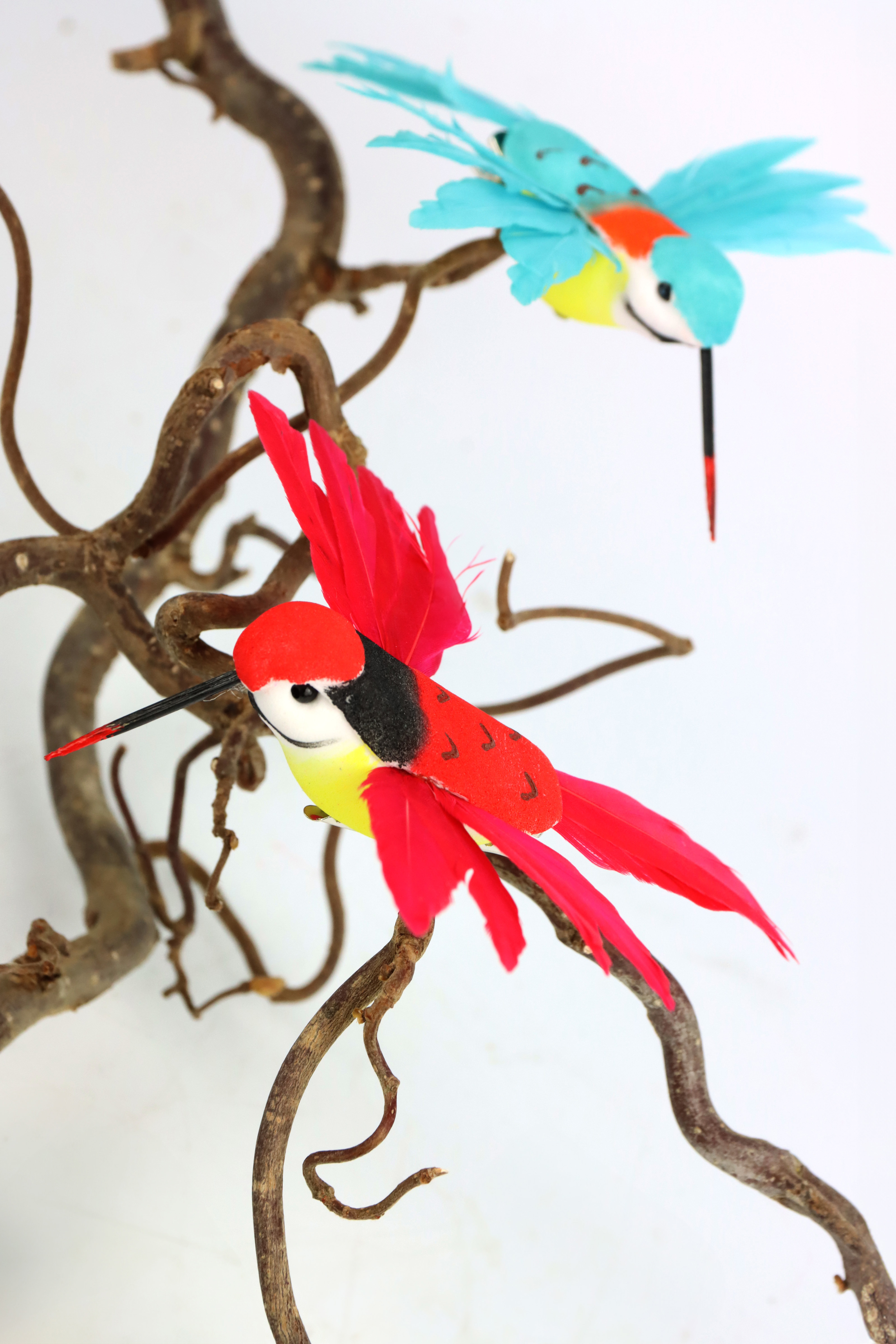 - Pájaros de delicado diseño fabricados en poliestireno y plumas artificiales