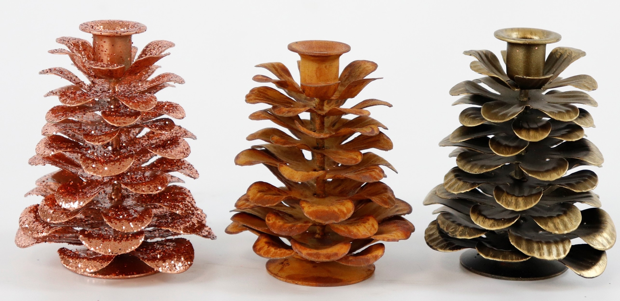 El juego de tres piezas consta de una selección de candelabros de piñas de fino diseño, fabricados en metal plateado de alta calidad y tan elegantes como robustos. Miden aproximadamente 9 cm cada uno y encajan a la perfección en cualquier interior, ya sea como acentos llamativos o como complementos armoniosos. Cada candelabro individual está diseñado como una réplica detallada de una piña de pino, con detalles cuidadosamente elaborados que maximizan la belleza natural del pino.