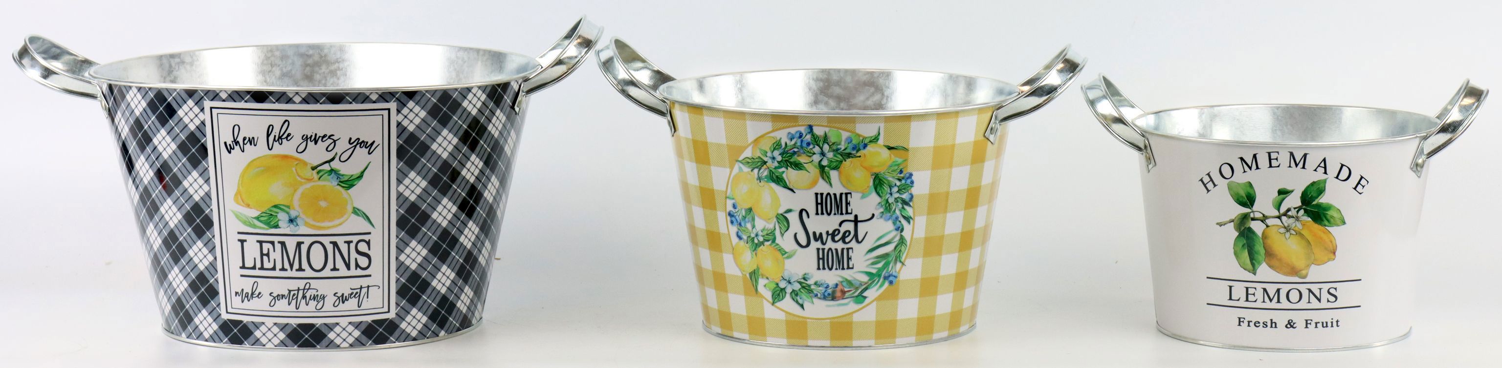 Chaque pot du set - d'une taille d'environ 36 cm, 30,5 cm et 26 cm - est décoré d'un charmant motif de citron qui confère à l'environnement une touche d'ambiance méditerranéenne. La construction robuste en zinc assure la durabilité et la résistance, ce qui rend ces pots non seulement décoratifs, mais aussi pratiques. Ils sont idéaux pour une utilisation à l'intérieur et à l'extérieur et offrent de nombreuses possibilités d'aménagement, que ce soit comme pots de plantes, comme rangement élégant ou comme élément de décoration à part entière.