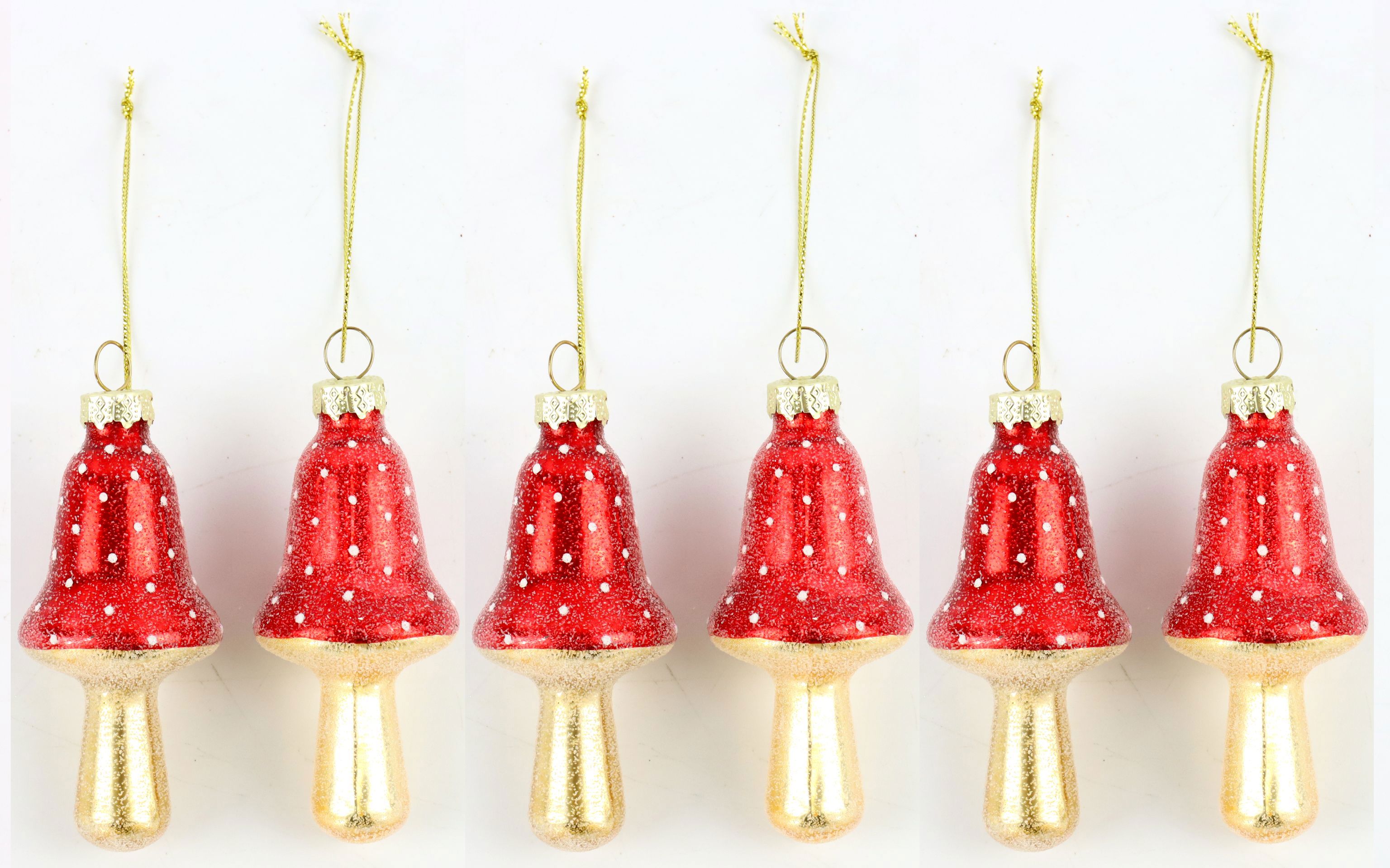 Le set de 6 pendentifs "champignons mouches" en verre, référence 8696, d'une taille moyenne de 8 cm, séduit par sa finition de qualité et son design exclusif. Le set assure une image harmonieuse et s'intègre parfaitement dans chaque intérieur. Les tons rouges et blancs lumineux se détachent avec effet sur les branches de sapin vertes et apportent des accents lumineux à votre décoration de Noël.