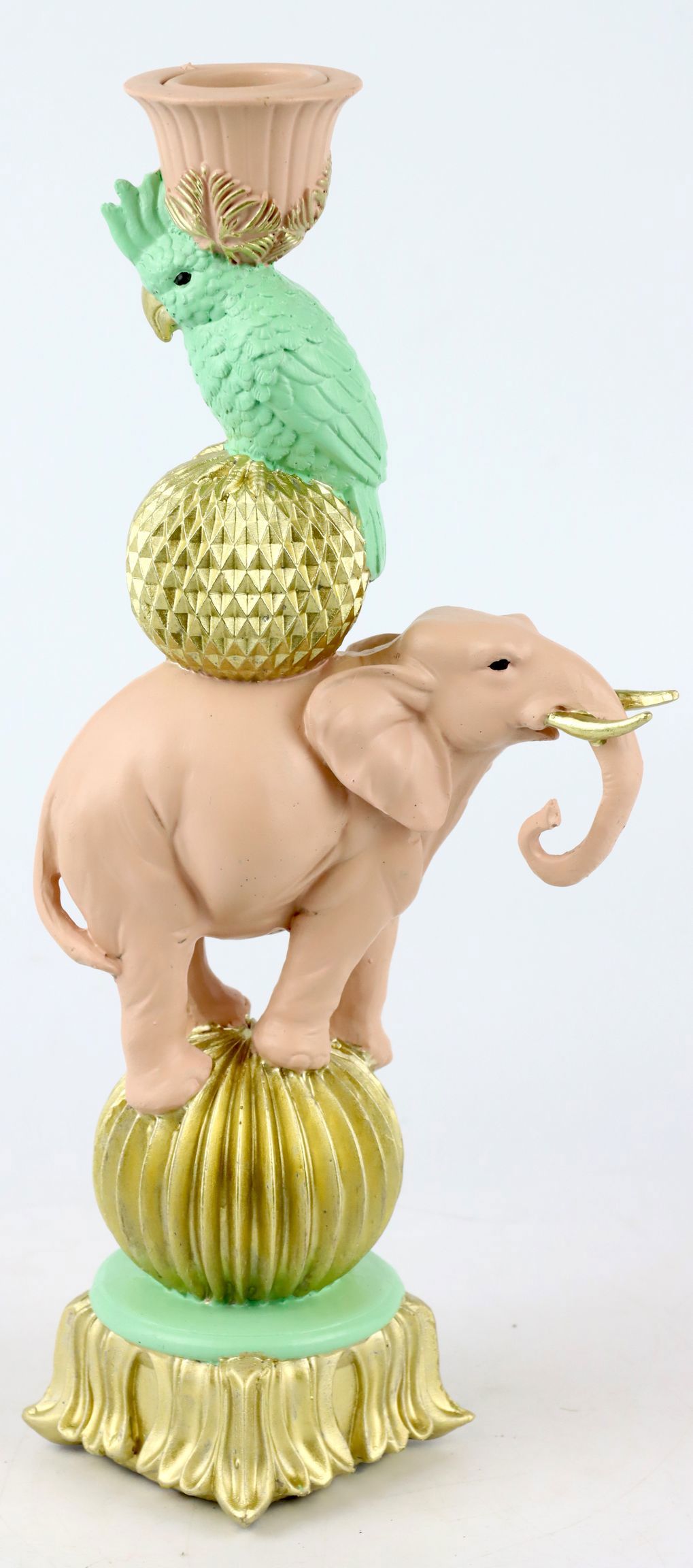 Faites entrer la magie de l'Extrême-Orient dans votre maison ou votre magasin avec notre impressionnant CHANDELET "EXOTIC ELEPHANT". Ce bougeoir exceptionnel allie la grâce des éléphants exotiques à des éléments de design fascinants dans les couleurs tendance beige et vert et devient ainsi le point fort de chaque pièce. Fabriqué à partir d'une combinaison de céramique, de polyrésine et de métal, ce chandelier décoratif promet non seulement stabilité et longévité, mais aussi un look sympathique et naturel qui s'intègre parfaitement dans les collections de printemps et d'été.