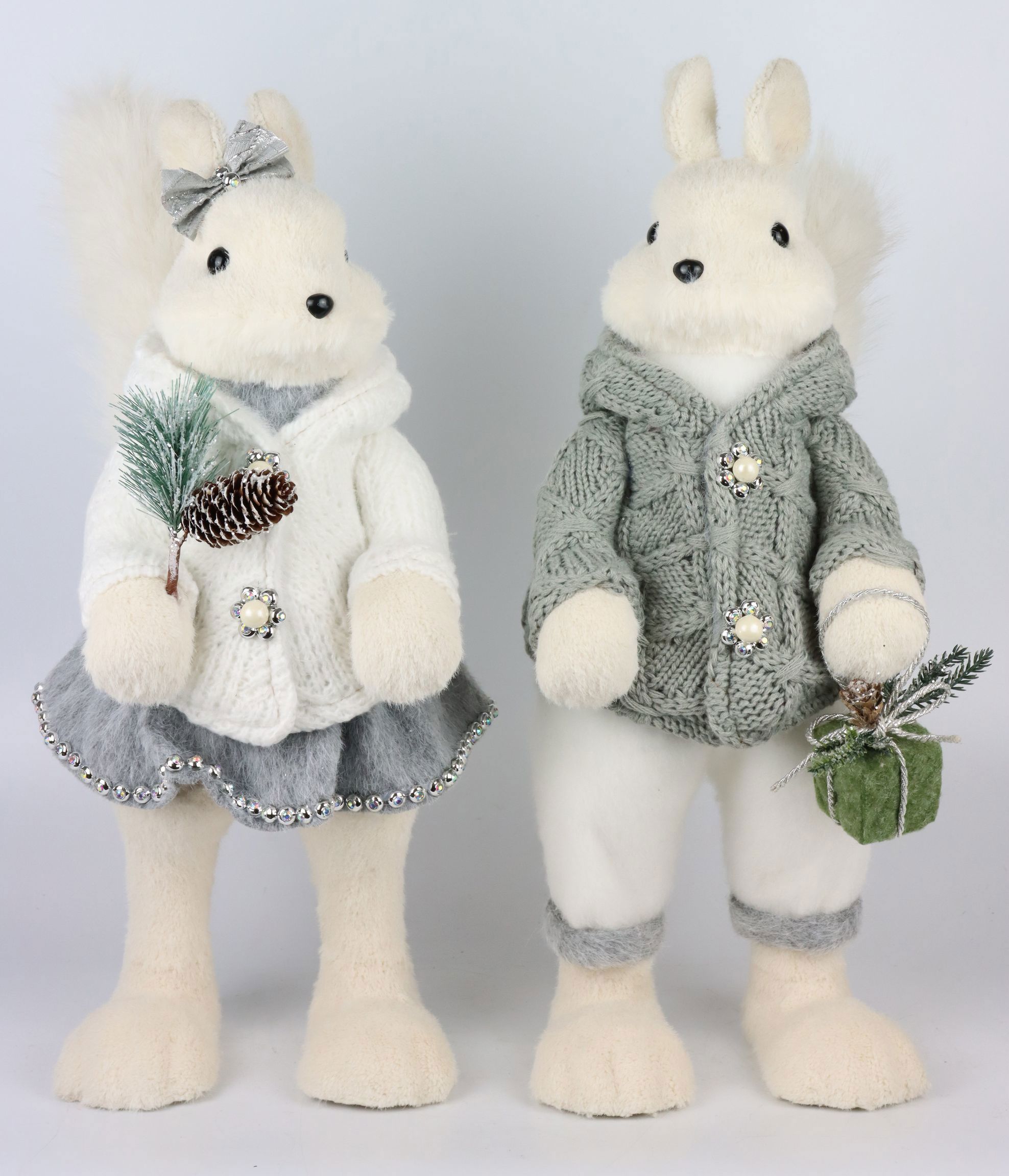 Ajoutez une touche de magie hivernale à votre assortiment pendant la période de Noël avec notre ravissant set d'écureuils "Frosty Tails". Ce set de deux pièces, composé d'une paire d'écureuils givrés, offre le complément parfait à toute décoration de Noël dans le commerce de détail. Ces animaux aux élégantes nuances de gris et de blanc dégagent une élégance à la fois raffinée et ludique qui apporte une touche festive à tout environnement.