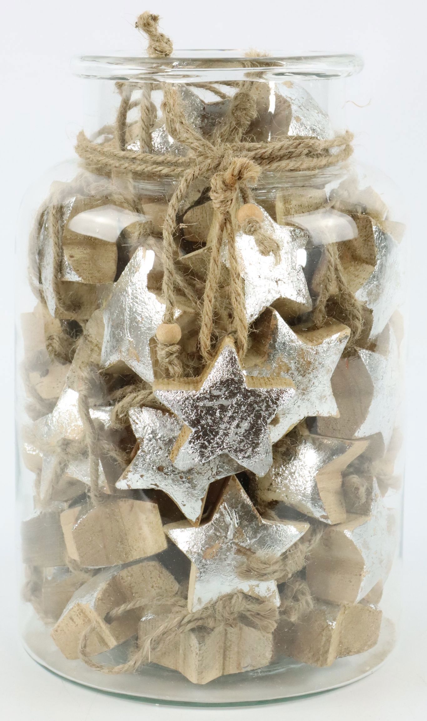 Le set se compose de 61 étoiles de couleur argentée, fabriquées en bois de manguier de qualité supérieure et mesurant environ 5 cm. Les étoiles sont présentées dans un joli verre d'environ 26 cm de haut, qui sert de vitrine parfaite pour ces beautés délicates. Chaque étoile est fabriquée avec soin pour garantir l'élégance et l'excellence. Elles sont suffisamment robustes pour durer plusieurs saisons, mais aussi suffisamment légères pour être suspendues à des sapins de Noël, des couronnes, des fenêtres et d'autres surfaces décoratives.