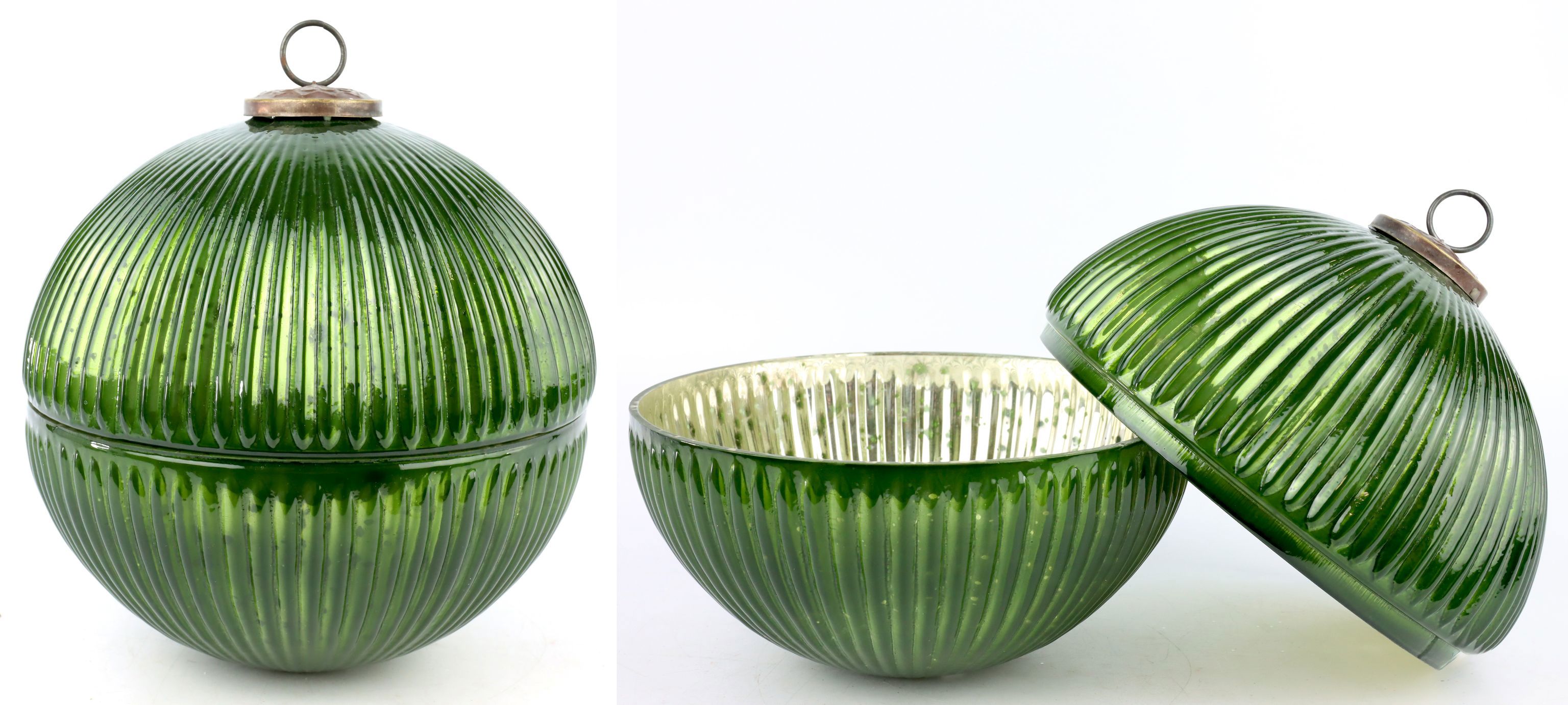 Notre BOÎTE EN VERRE "CHRISTMAS BALL" est un pendentif qui attire l'attention et qui a été soigneusement fabriqué dans le meilleur verre. Dans un ton vert de Noël, la boîte transmet une ambiance festive et constitue en outre un élément intéressant pour chaque pièce. Avec sa taille d'environ 20 cm, c'est une pièce étonnamment polyvalente qui fait une grande impression dans un petit espace. Elle peut être présentée comme pièce de décoration sur un comptoir ou utilisée comme élément de vitrine suspendu.