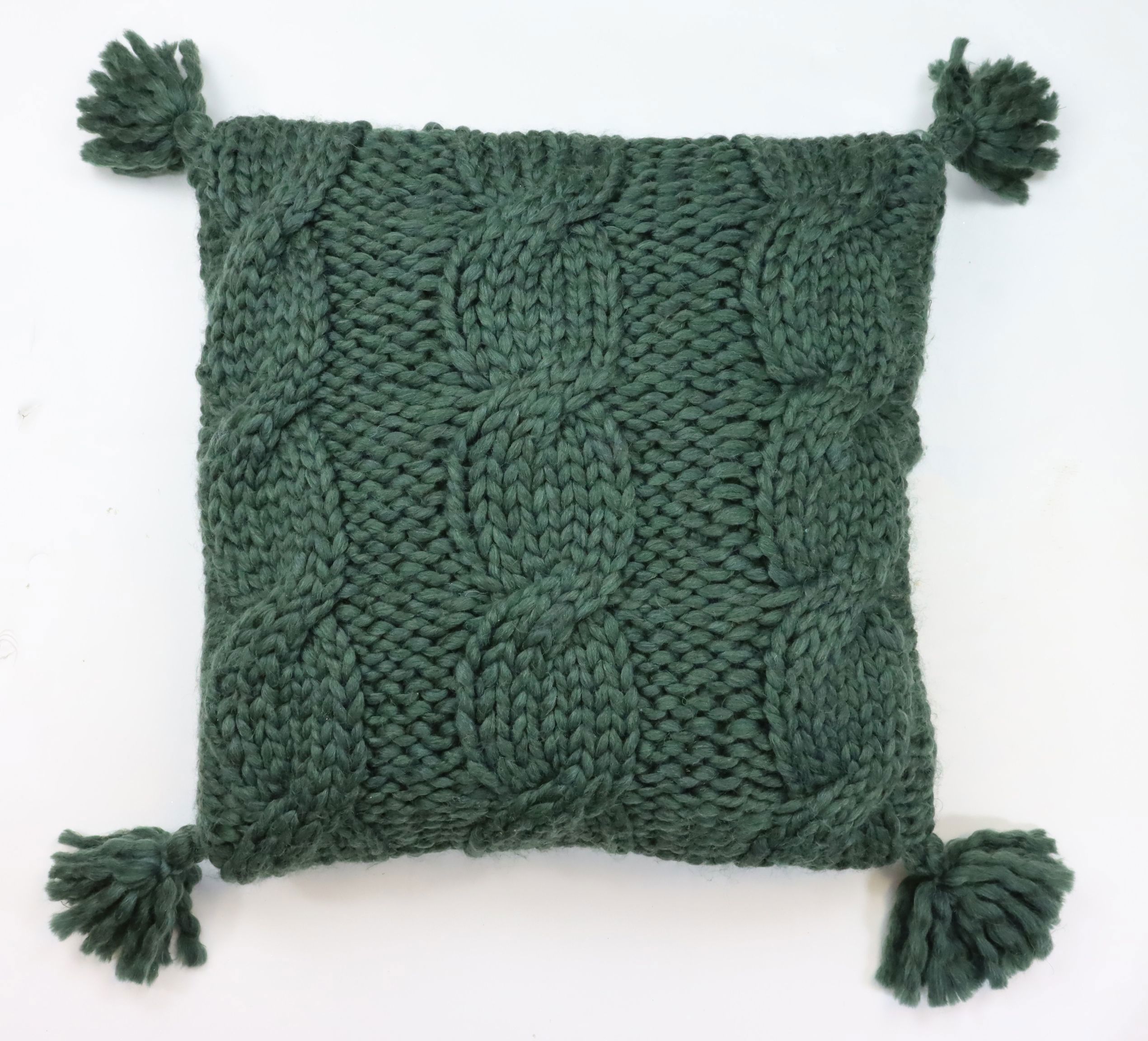 Mots-clés : housse de coussin, COUSSIN Tricoté GSTAAD, accessoire d'intérieur, conception de produit durable, coussin vert foncé, collection automne/hiver, bouteilles PET recyclées, habitat et style de vie, produit écologique, aménagement durable.