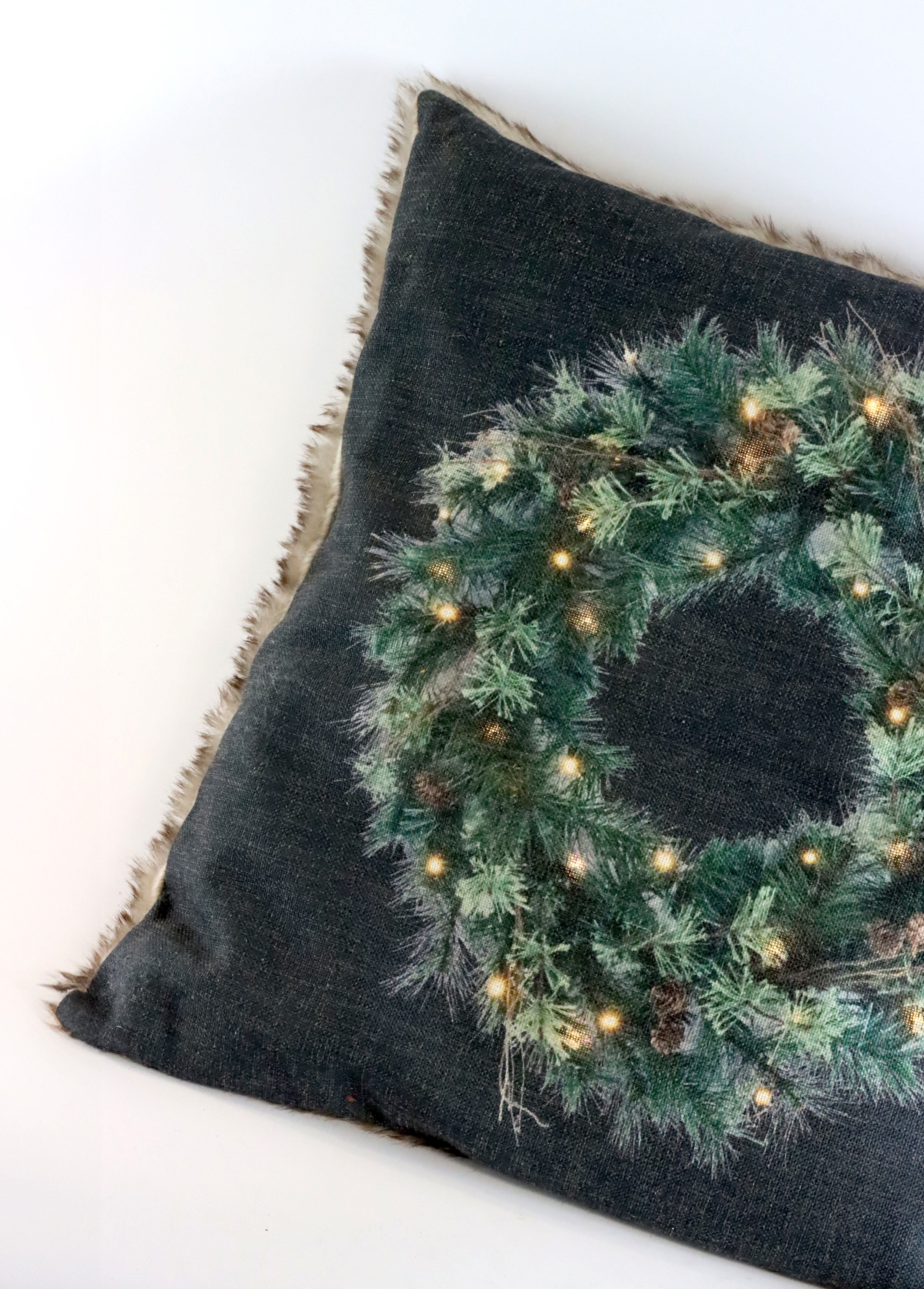 Mots-clés : housse de coussin, décoration de Noël, couronne LED, à piles, accessoires pour la maison, style de vie, ambiance de fête dans la maison.