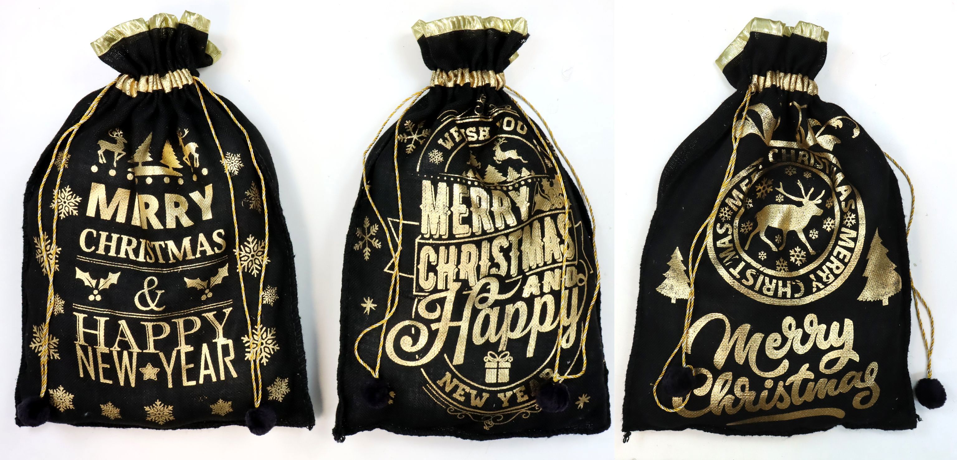 FRIlluminez vos fêtes de fin d'année avec le sac de Noël "Luxury Xmas" S/3, référence 7387. Cet ensemble de trois sacs de Noël en jute et coton luxueux est un accessoire indispensable pour la période de Noël et offre une manière élégante de présenter et de ranger les cadeaux.