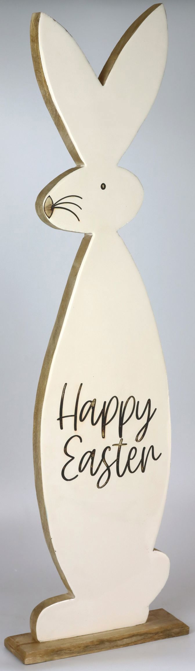 Convainquez avec ce lapin en bois impressionnant et faites entrer un véritable accroche-regard dans votre magasin. Commandez le lapin en bois "Happy Easter" directement dans notre boutique en ligne et offrez à vos clients une véritable valeur ajoutée en matière de décorations printanières et pascales stylées.
