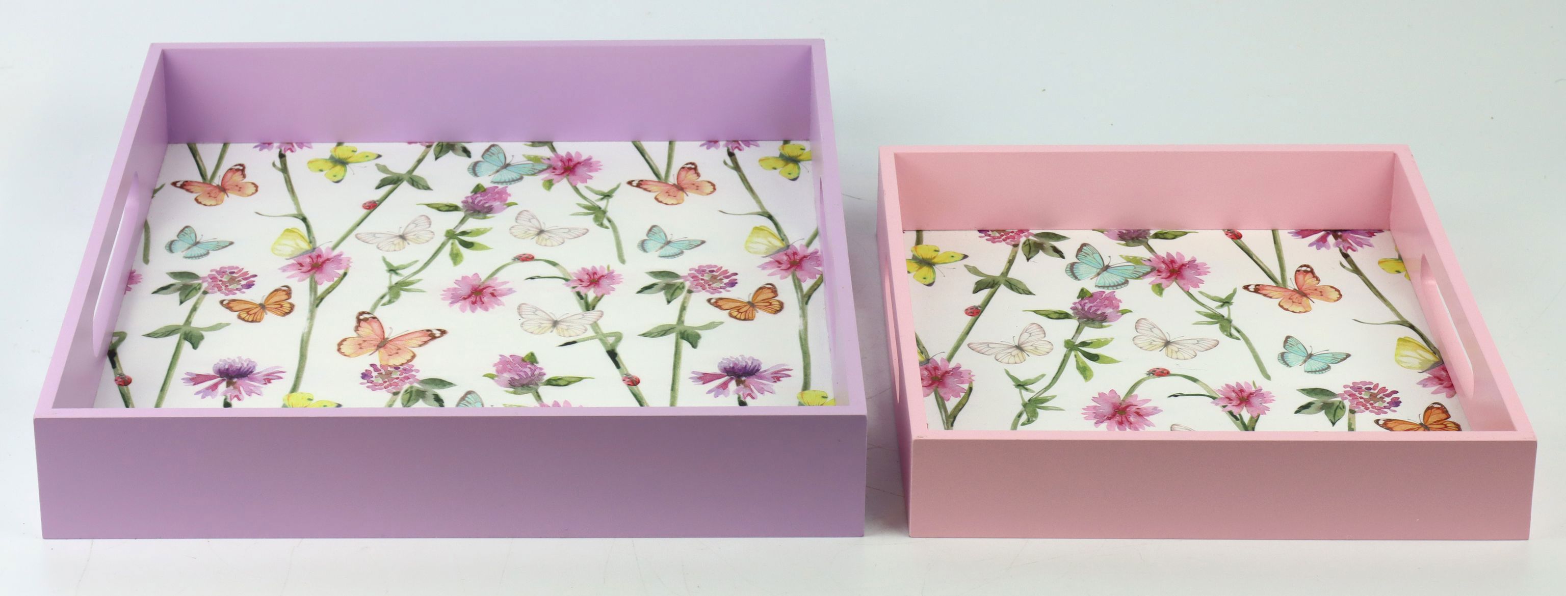 Scoprite il raffinato set di vassoi "Butterfly" in un design stagionale primavera/estate, un'aggiunta perfetta a qualsiasi casa nel settore living e lifestyle. Questo set da 2 pezzi colpisce per il suo design vivace con una delicata stampa di farfalle nei toni tenui del viola e del rosa. I vassoi non solo offrono un uso pratico, ma aggiungono anche un tocco di eleganza e freschezza estiva a qualsiasi ambiente.