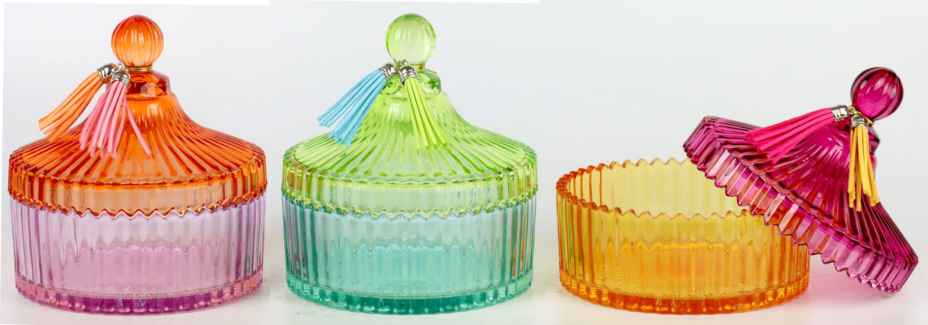 Create un'atmosfera colorata nel vostro negozio con il set di vasetti di vetro "Splash of Colours", articolo 1734, ideale per la vendita al dettaglio di articoli per la casa e il lifestyle. Il set comprende tre squisiti barattoli di vetro che non solo convincono per l'eccellente qualità, ma anche per l'accattivante scelta di colori. Con dimensioni di circa 14x15 cm ciascuno, questi barattoli sono perfetti per conservare una grande varietà di piccoli oggetti e sono anche un'elegante aggiunta a qualsiasi spazio abitativo.