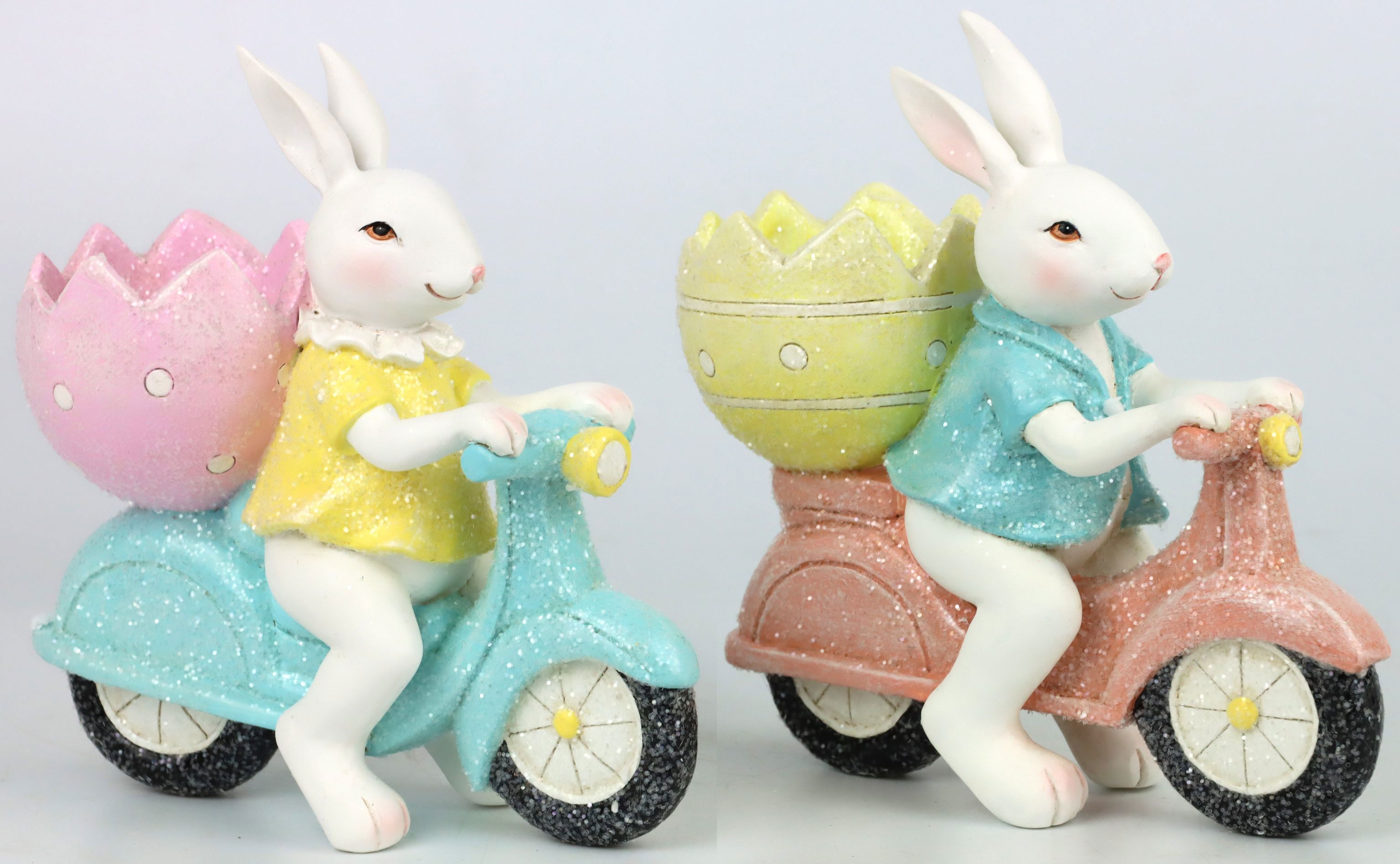 Scoprite la decorazione pasquale perfetta per la vostra cartoleria nel settore della casa e del lifestyle: l'esclusivo set di 2 pezzi "EASTER SCOOTER BUNNY". Queste figure dettagliate, realizzate in robusta poliresina, sono un richiamo ideale per le vostre esposizioni e vetrine. Con un'altezza di circa 13,5 cm, i coniglietti "EASTER SCOOTER" sono ideali per creare un'atmosfera pasquale allegra e invitante che farà la gioia dei vostri clienti.