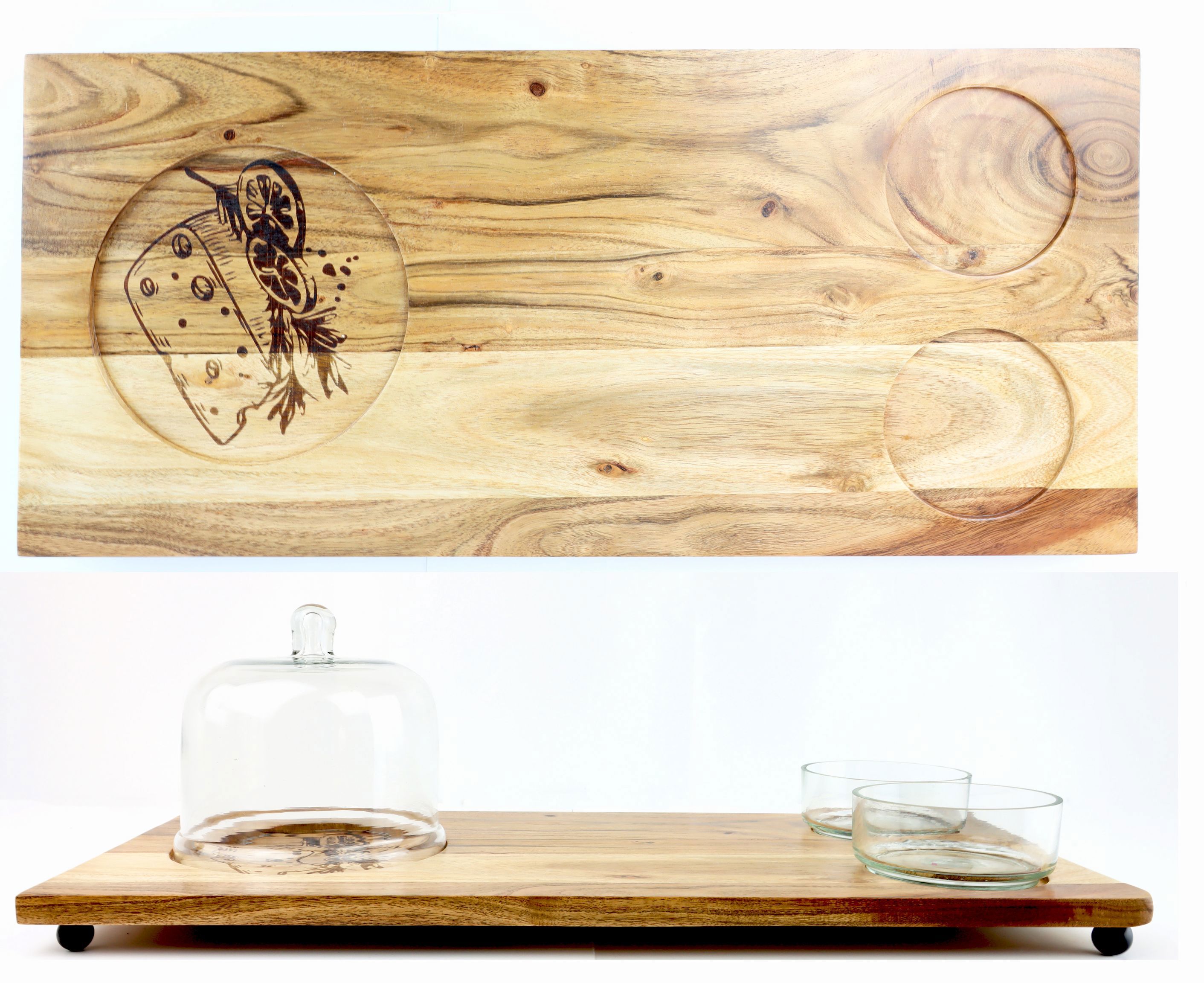 Das SERVIERENSEMBLE "BREAD&BUTTER" besticht durch seine vielseitige Einsatzmöglichkeit. Ob für ein stilvolles Frühstück, einen eleganten Brunch oder ein abendliches Get-together, das Ensemble bietet Platz für Brot, Butter und weitere kulinarische Köstlichkeiten. Die gläserne Glocke schützt die Zutaten vor äußeren Einflüssen und sorgt gleichzeitig für eine ästhetische Präsentation. Die beiden Schalen aus Glas und Akazienholz sind ideal, um Beilagen oder Dips appetitlich zu servieren.