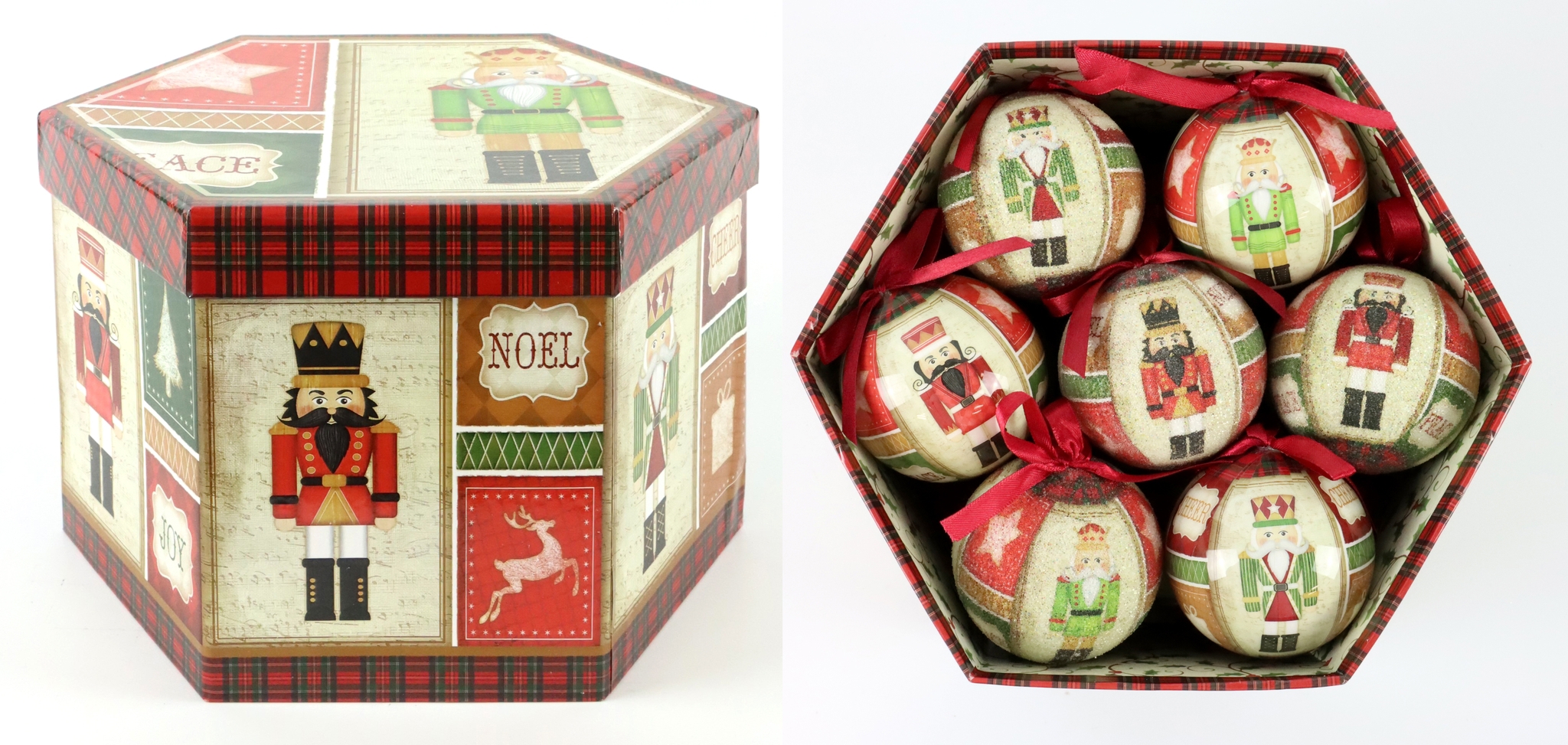 Ihre Einzelhandelskunden werden die auffälligen Designs und die hervorragende Qualität dieser Weihnachtsdekoration schätzen. Ob zum Dekorieren des Weihnachtsbaumes oder zum Aufstellen auf Tischen und Regalen, diese Kugelbox "Nussknacker" S/14 wirkt in jedem Setting feierlich und stilvoll.