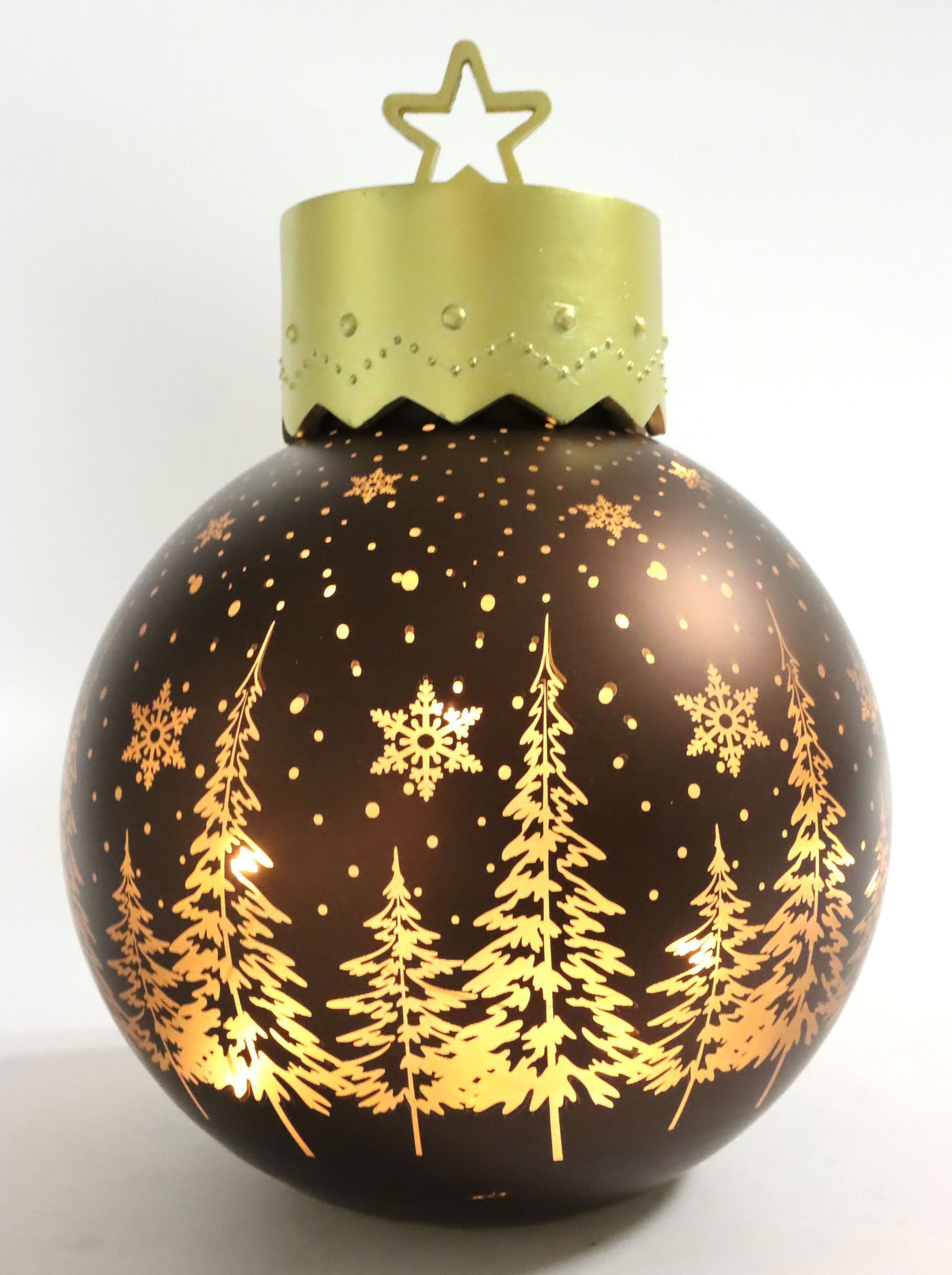 Die LED-Leuchtkugel "Winterwald" mit einem Durchmesser von ca. 25 cm besteht aus einer harmonischen Kombination von Glas und Kunststoff in einem anziehenden Braunton. Diese beeindruckende Mischung macht die Kugel sowohl leicht und bruchsicher als auch zu einem stilvollen Blickfang in jedem Schaufenster oder Regal. Die filigran eingearbeiteten Winterwald-Motive transportieren Ihre Kundschaft direkt in ein winterliches Märchen.
