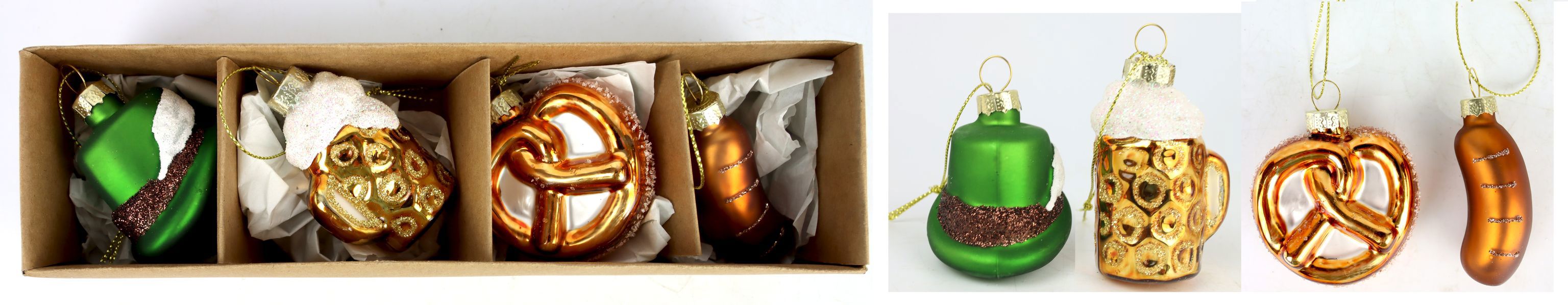 Suchen Sie nach einzigartigen Weihnachtsartikeln, die sich von der Masse abheben? Unser Glasschmuck-Set erfüllt genau diesen Anspruch und sorgt für ein unvergessliches Einkaufserlebnis. Zudem ist der Glasschmuck "Oktoberfest" ein ideales Geschenk für Kunden, die nach besonderen und einzigartigen Weihnachtsverzierungen suchen, um ihre Festtage zu verschönern.