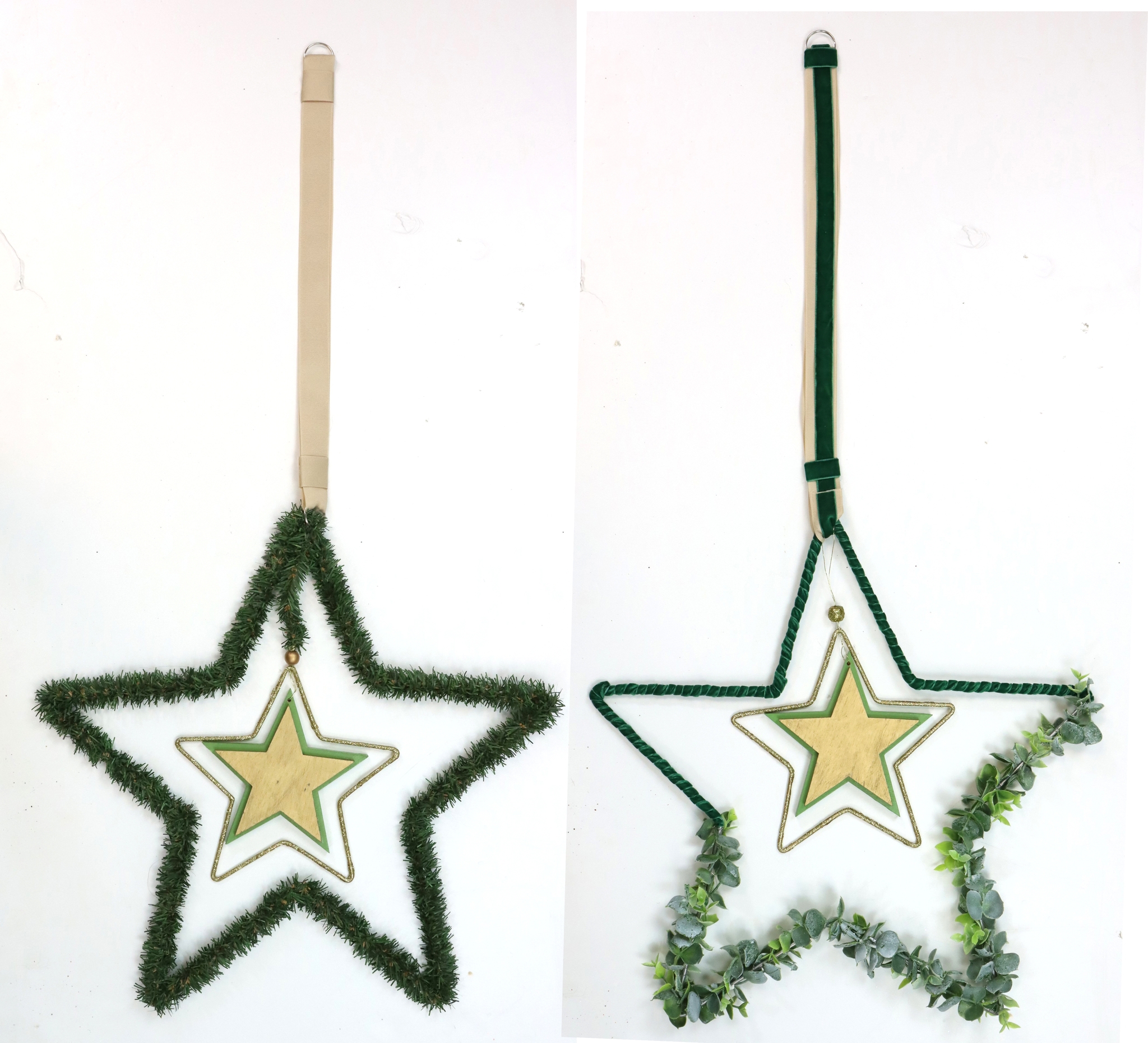 Das Set besteht aus zwei liebevoll gestalteten Ziersternen, die durch ihre Mischung aus hochwertigen Materialien wie Metall, Kunststoff, Holz und Samt bestechen. Mit einer beeindruckenden Größe von etwa 40 cm sind sie ideal, um als zentraler Bestandteil Ihres Dekorationskonzeptes zu fungieren. Die unterschiedlichen Texturen der Materialien fügen sich harmonisch ineinander und erzeugen einen luxuriösen und gleichzeitig gemütlichen Look, der perfekt zur Weihnachtszeit passt.