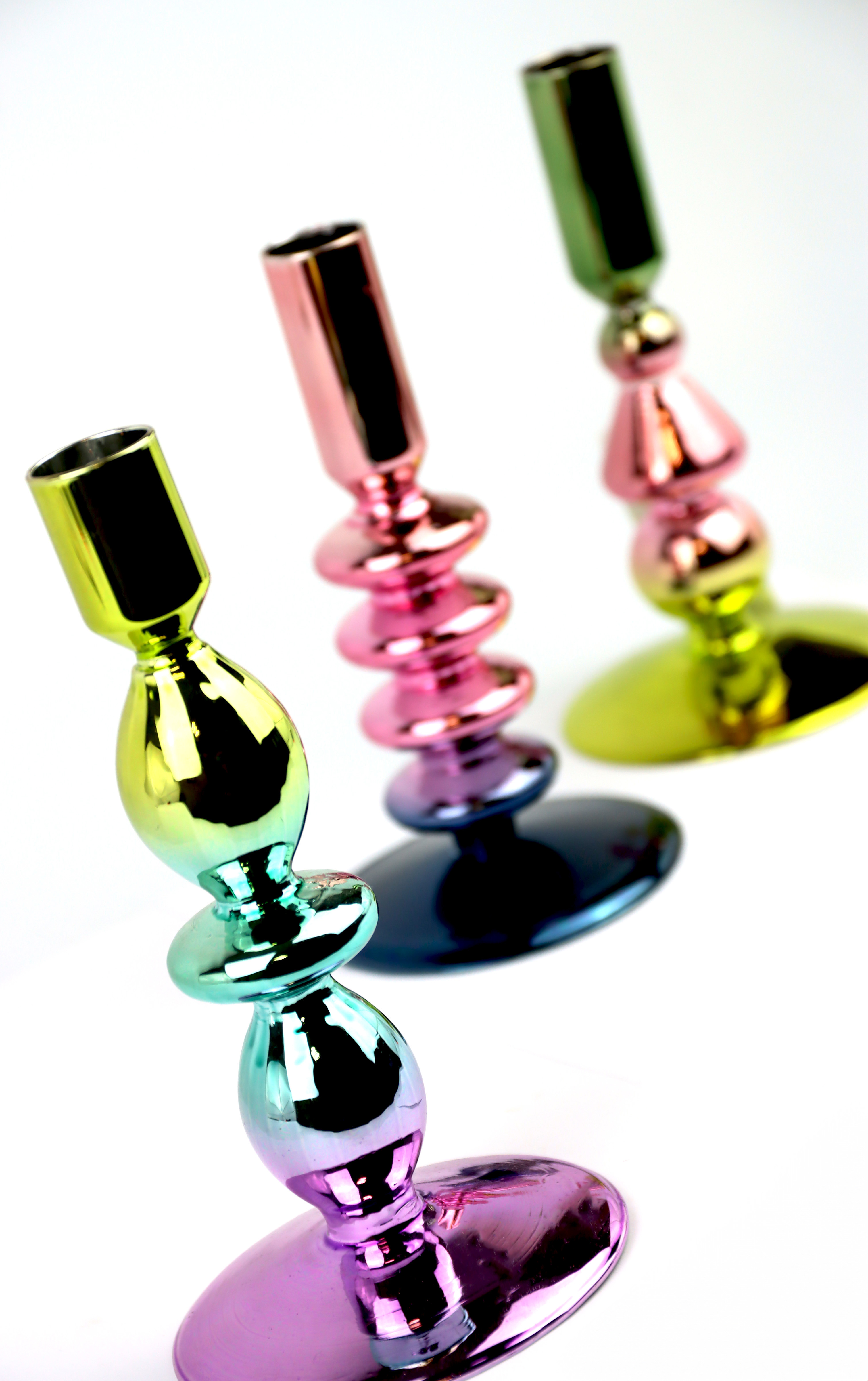 SEO-optimised keywords for the product are: high-quality glass candlesticks, colourful candlesticks, decorative candlesticks for retail, lifestyle decoration, stylish home accessories.