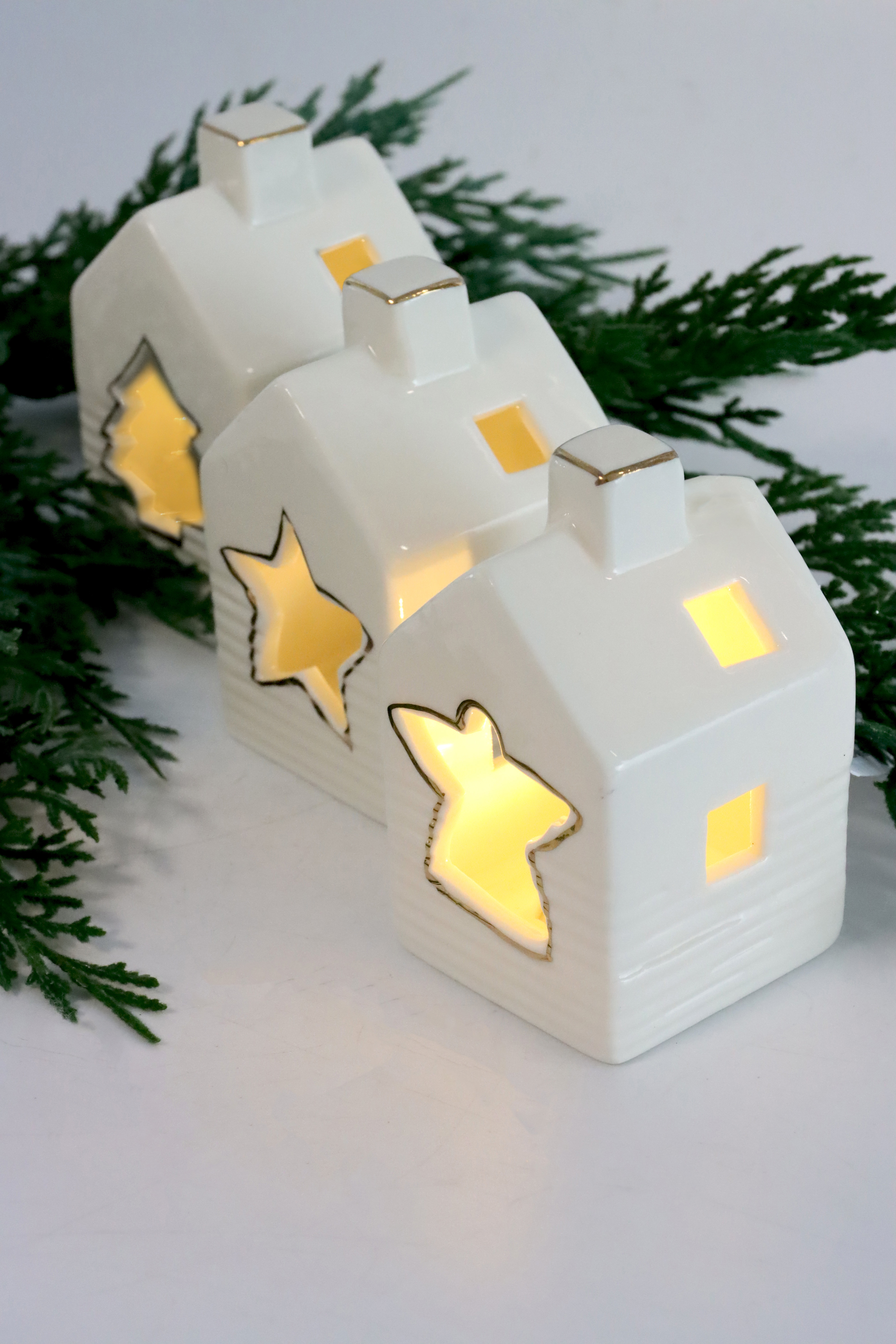 Give your retail location a new, festive glow with our enchanting "Hus" LED house set. This three-piece set, consisting of LED illuminated houses, brings the magical Christmas tree, the heavenly angel and twinkling stars directly to your retail shelves. Each house is made of high-quality ceramic and measures approx. 11.5 cm in height - perfect for positioning in different places in your shop and attracting the attention of your customers.