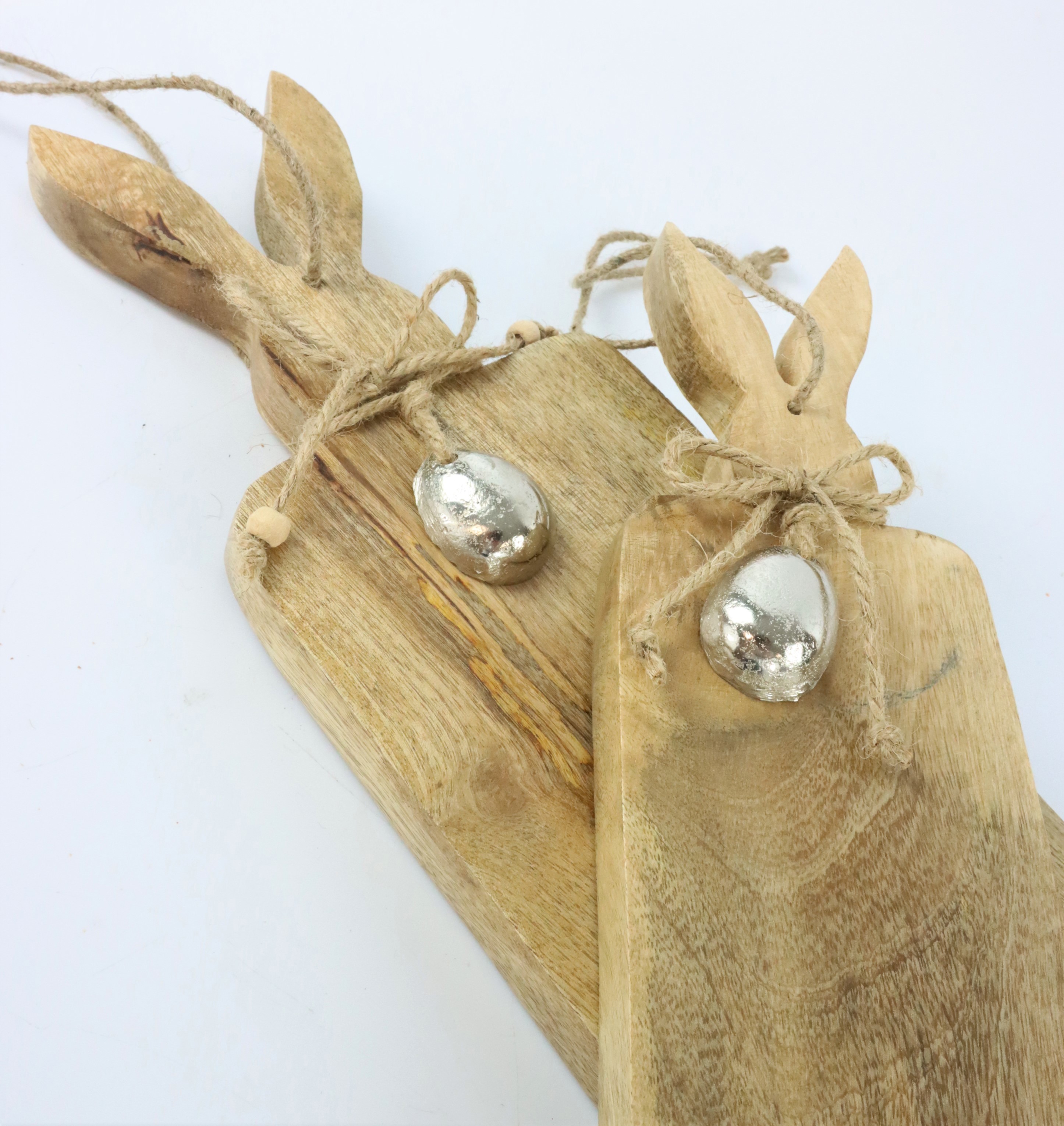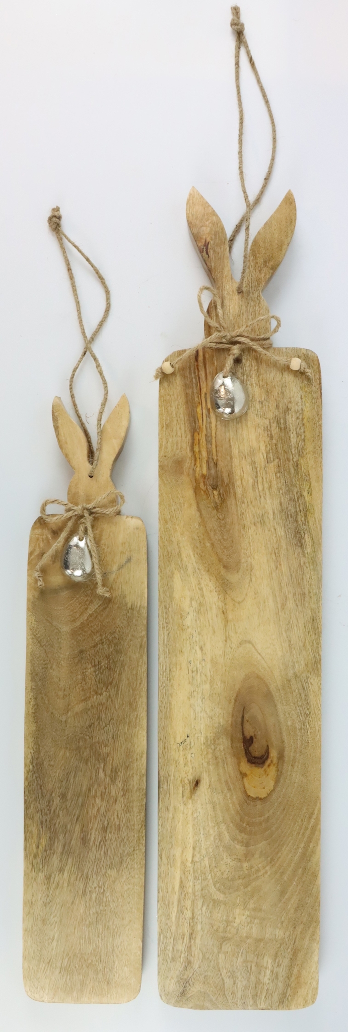 Measuring approx. 68 cm and 50 cm, the "Hasenschmaus" set can be used in a variety of ways: Whether as a charming decoration on the festive table, as a stylish base for Easter treats or as decorative elements in shop windows, attracting the attention of passers-by - these wooden boards are always an eye-catcher. The durable mango wood impresses with its warm colouring and individual grain, which makes each board unique.