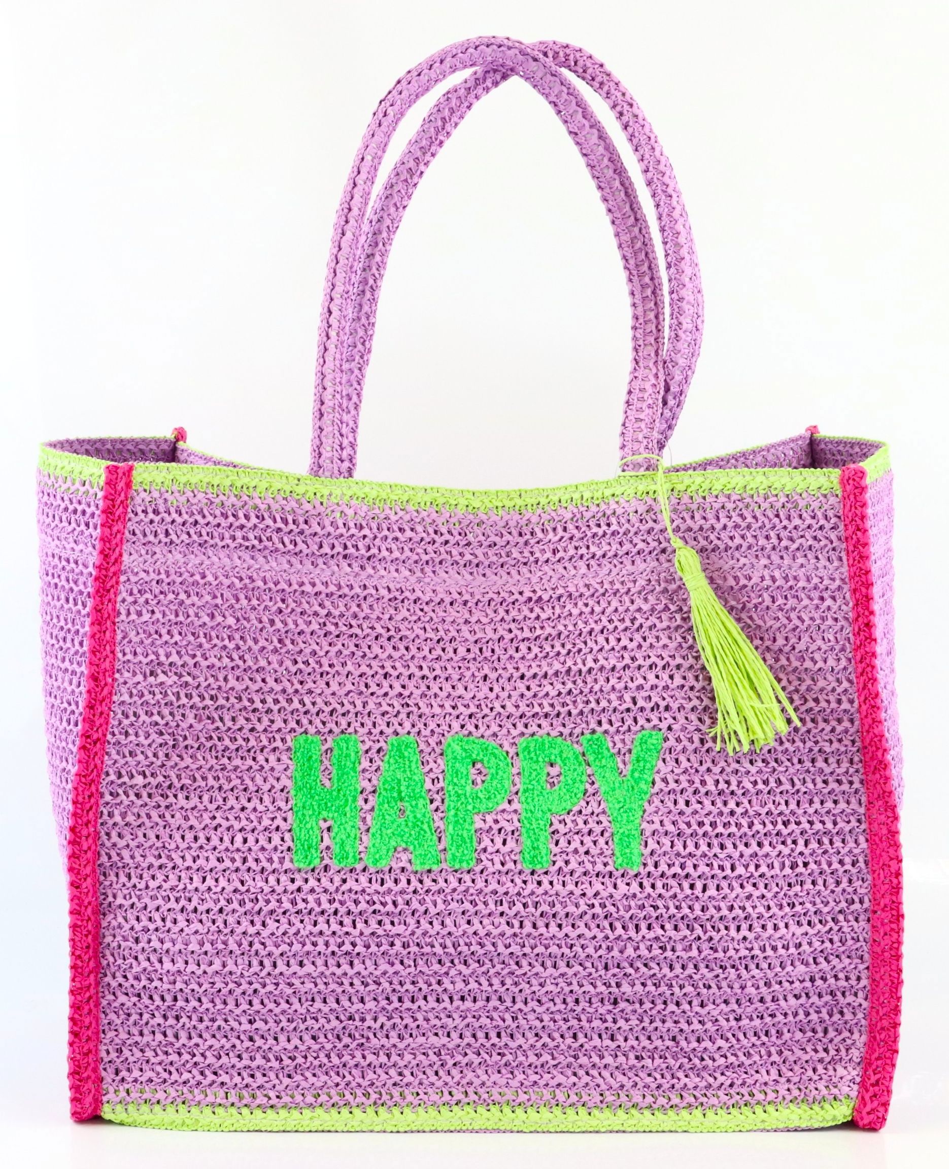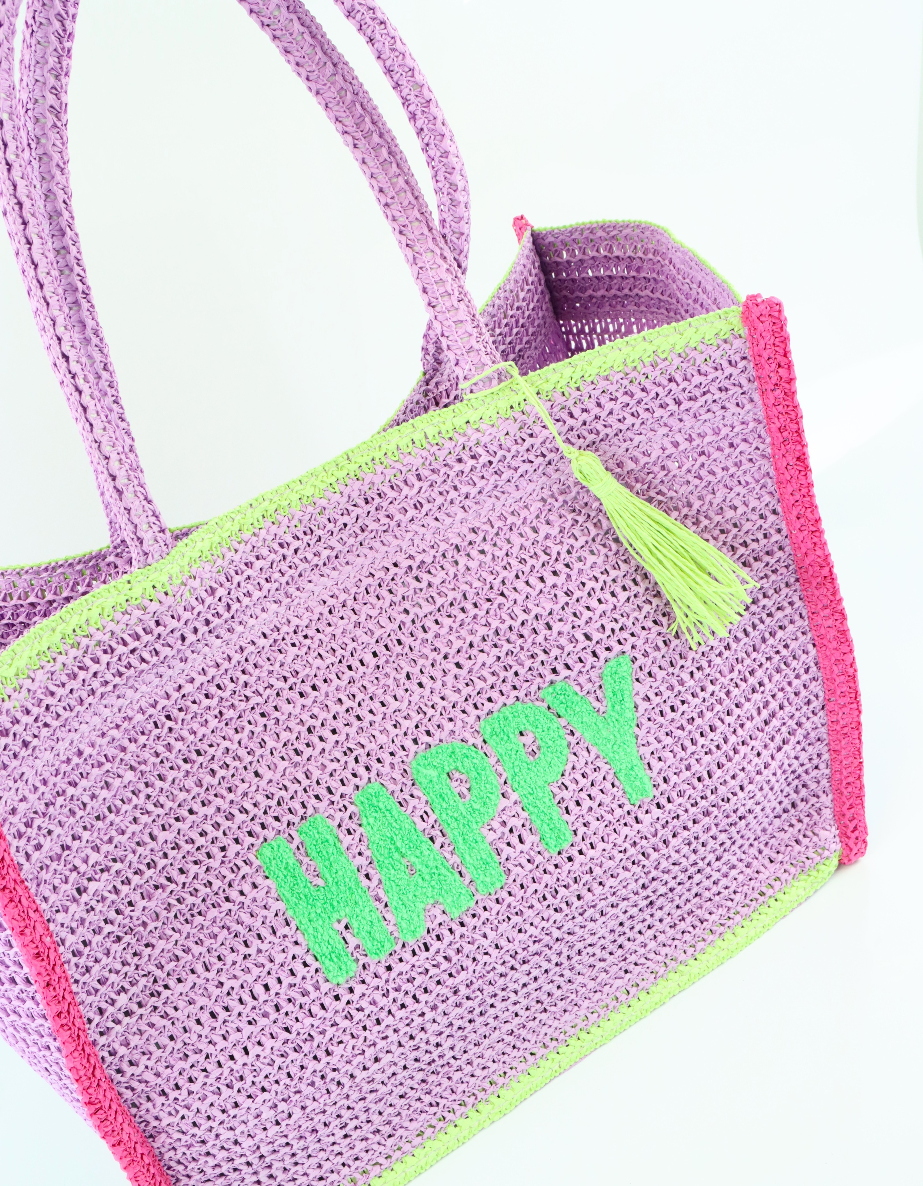Añada un toque refrescante a su surtido con nuestro exclusivo shopper "Happy" de la colección primavera/verano. Este extraordinario bolso no es una simple bolsa, sino una expresión de alegría y despreocupación. Con su vibrante color púrpura y sus divertidas letras "Happy", atrae todas las miradas y es el accesorio perfecto para todos los clientes preocupados por la moda.