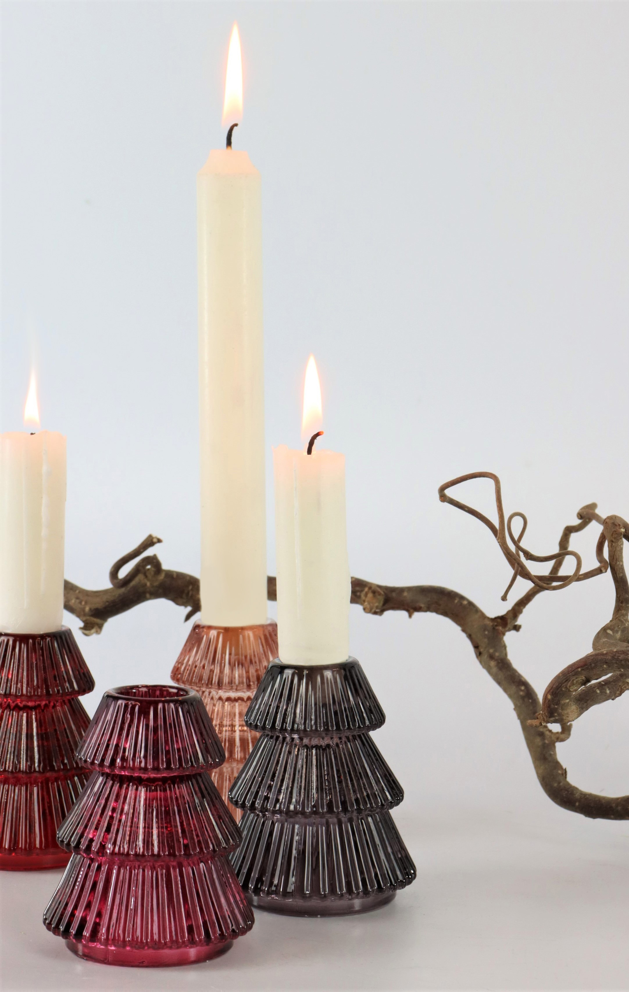 Los candelabros "árbol", artísticamente diseñados, simbolizan abetos de cristal delicadamente modelados. El juego consta de dos piezas únicas rojas y dos negras con un diseño sencillo pero elegante. Con un tamaño de unos 8 cm, estos candelabros aportan un acento impresionante a su tienda navideña y evocan una encantadora atmósfera luminosa.