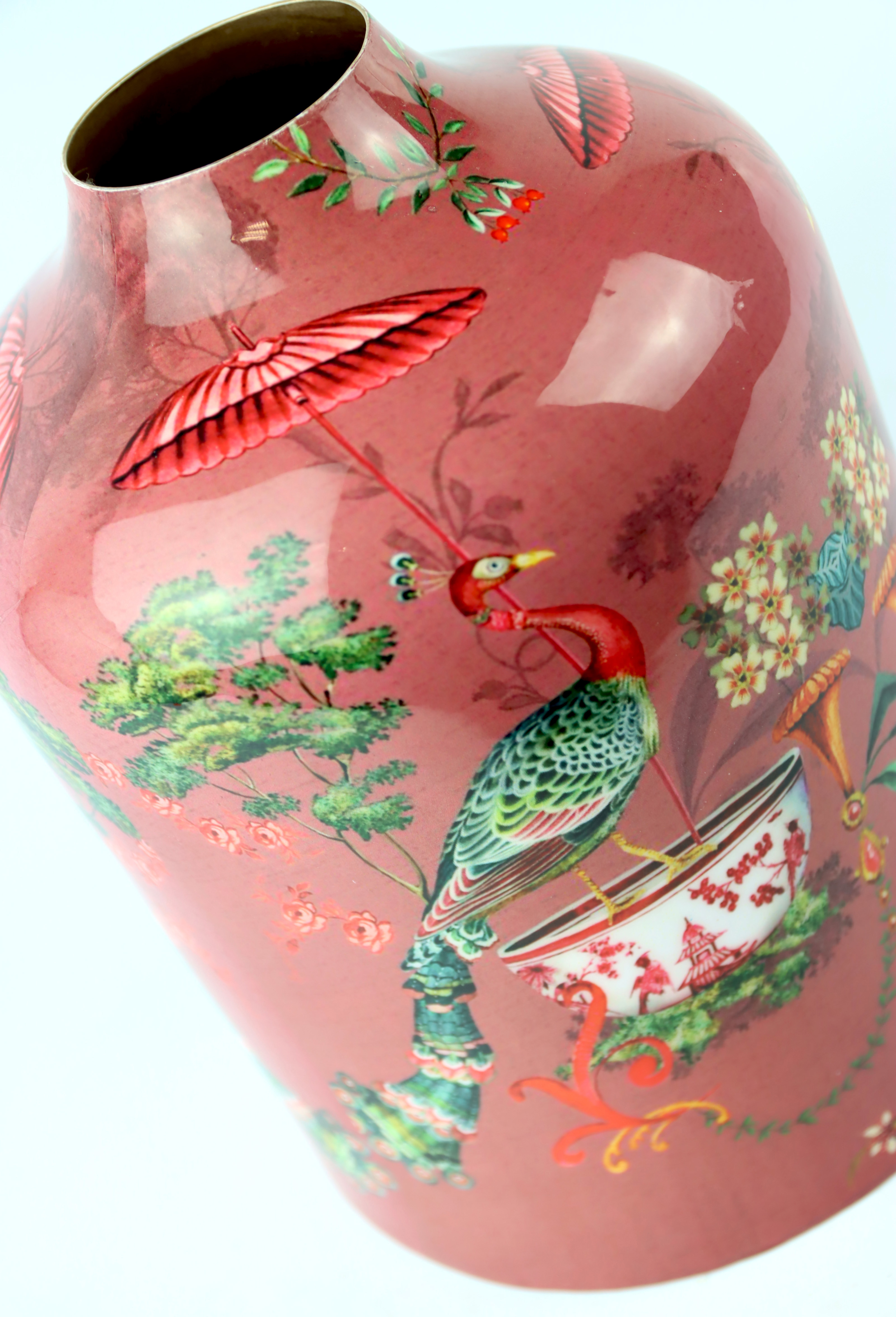 Le vase "Asian Fauna" se distingue par son design artistique et ses couleurs harmonieuses dans un ton rouge saturé. Un paon impressionnant, symbole de beauté et de grâce dans la culture asiatique, orne la surface du vase et attire immédiatement tous les regards. Avec son diamètre généreux de 18 cm et sa hauteur de 23 cm, le vase est idéal pour des compositions florales voyantes ou peut servir d'élément de décoration autonome pour donner une touche exotique à votre intérieur.
