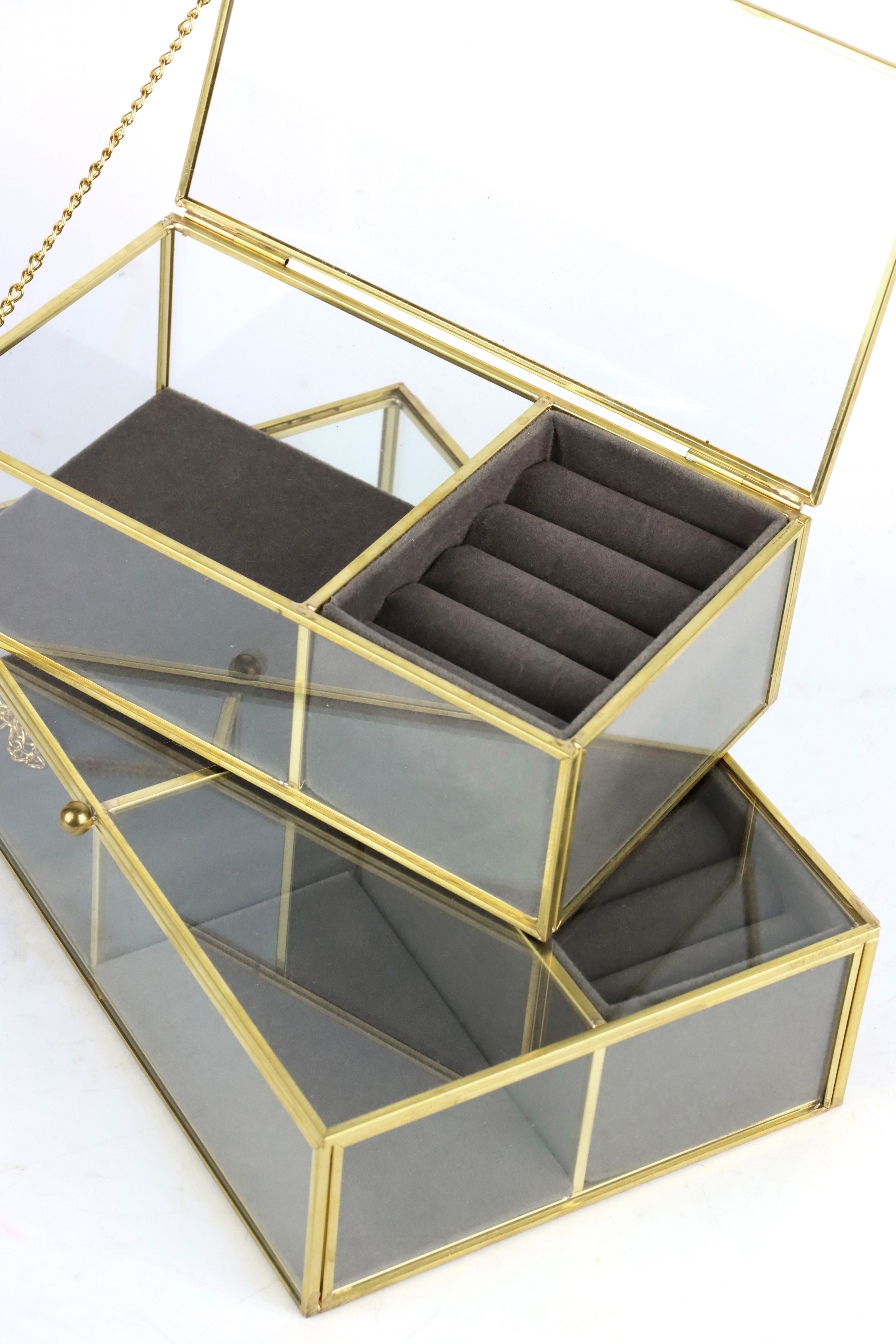 - Coffret à bijoux 2 pièces de haute qualité en matériau robuste et transparent avec un élégant bord doré.