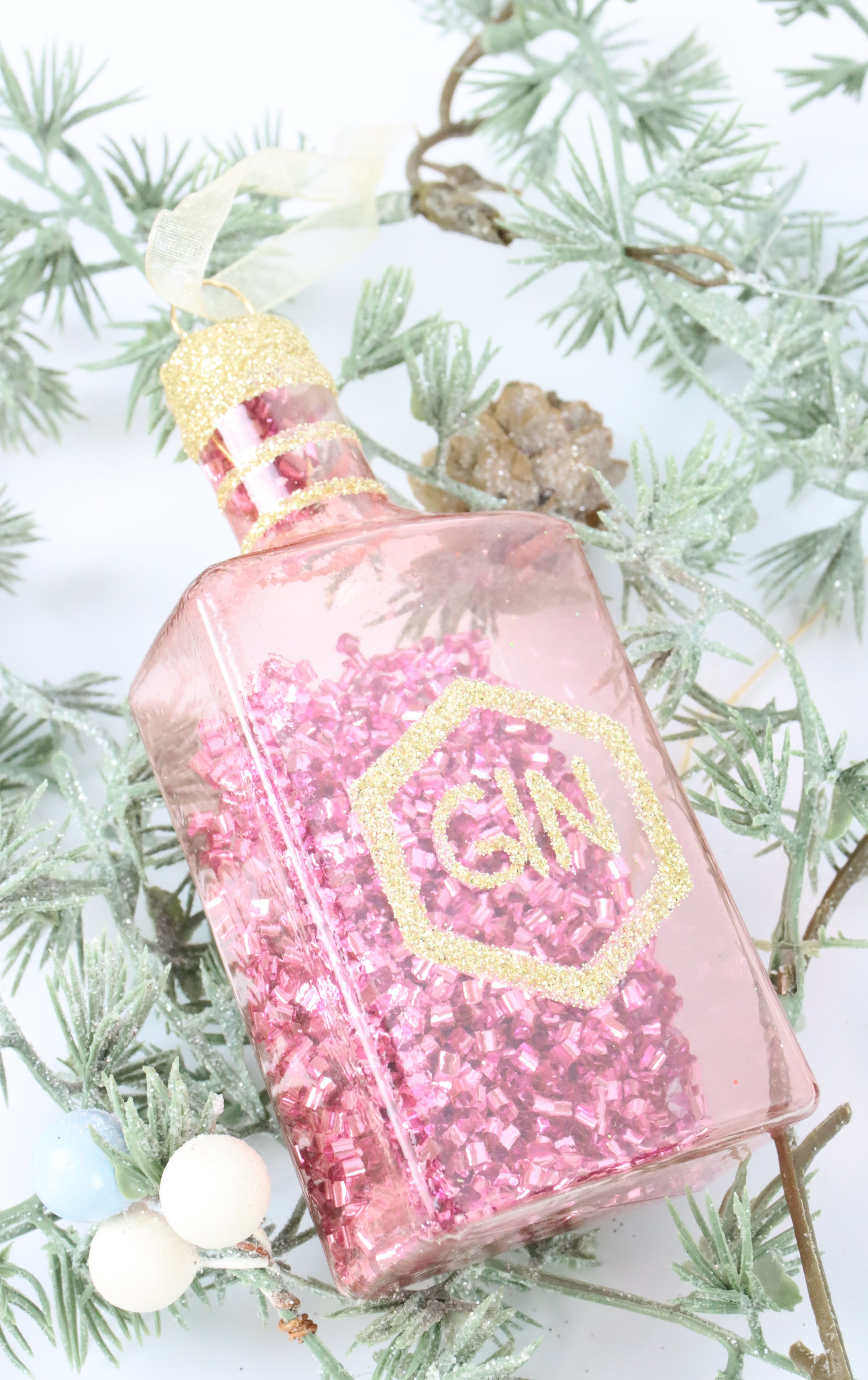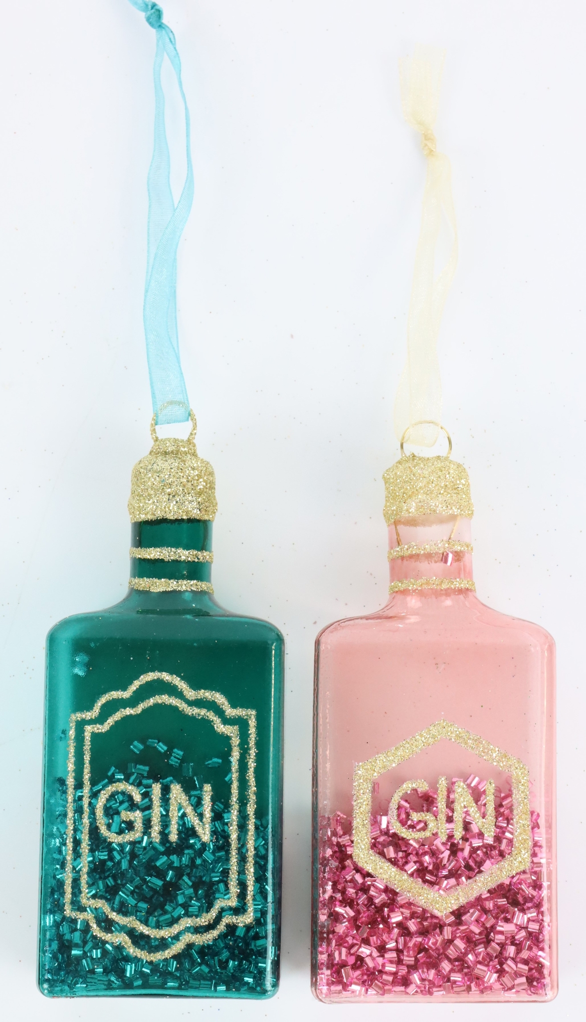 Mots-clés SEO : bijoux en verre "Gin", décorations exclusives pour le sapin de Noël, habitat et style de vie, design élégant, produits en verre de qualité, élément de décoration festif, décoration de Noël robuste.