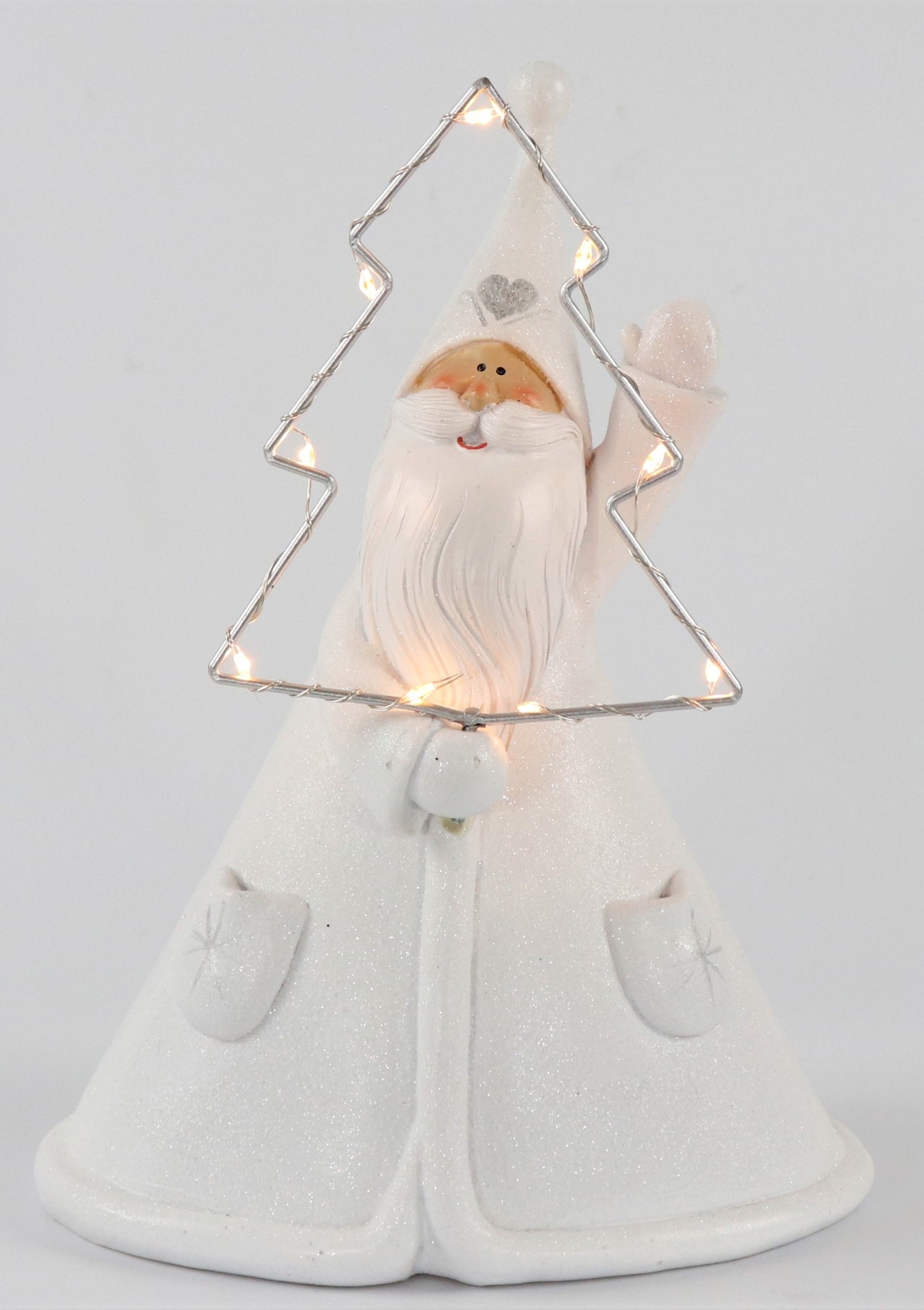 Donnez une touche magique à votre monde merveilleux de l'hiver dans le commerce de détail avec notre adorable Père Noël à LED. Le Père Noël LED avec sapin en céramique noble et en métal travaillé en détail est la décoration de fête parfaite pour chaque maison élégante et chaque magasin tendance dans le domaine de l'habitat et du style de vie. D'une hauteur d'environ 23 cm, ce Père Noël à piles n'attire pas seulement le regard, mais constitue également un point fort pratique pour votre saison de Noël.