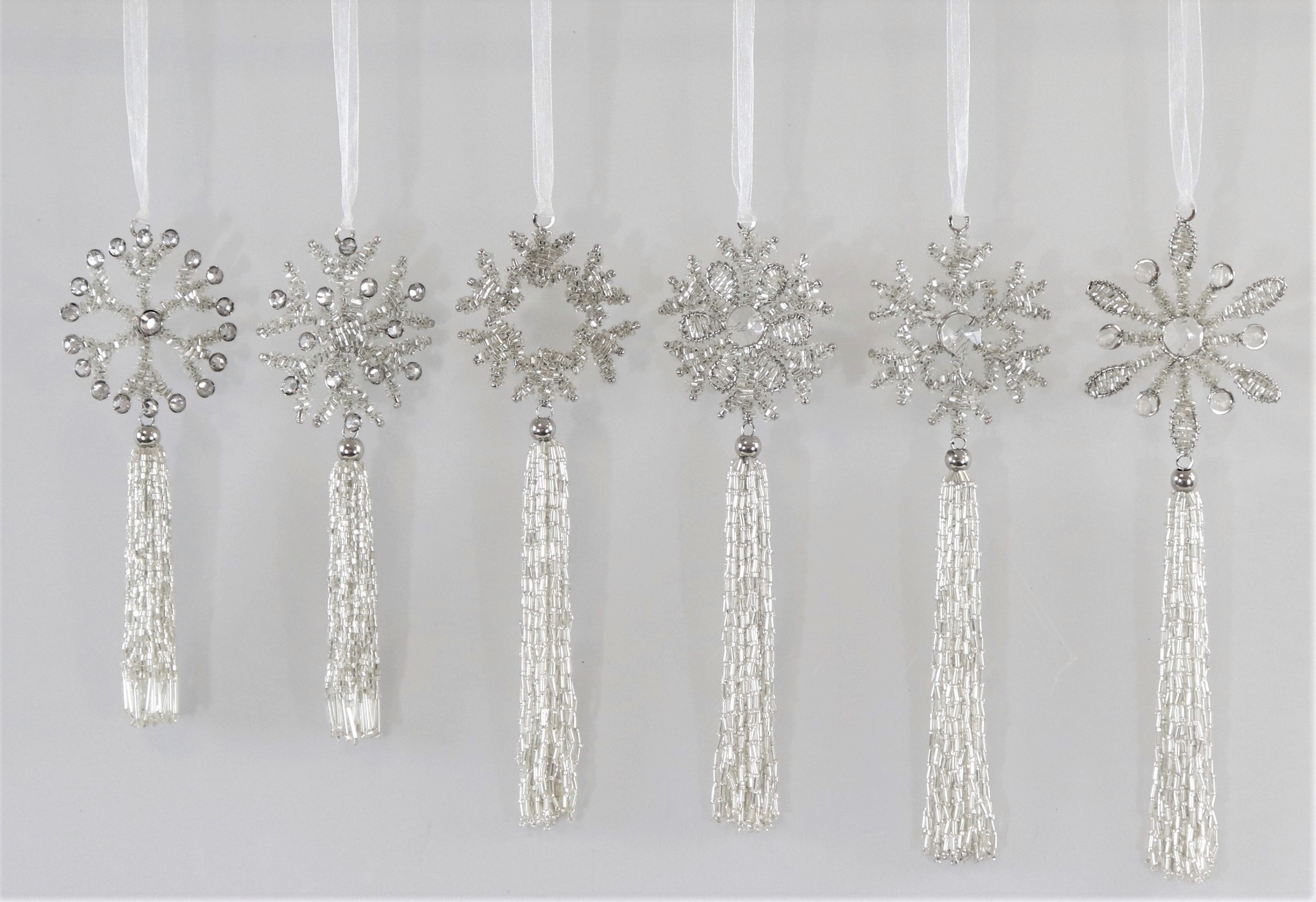 Mot-clé : houppes en cristal, décorations de Noël, accessoires pour la maison, élégance, luxe, couleur argentée, assortiment de Noël, espace de vente au détail, salon, environnement décoratif.