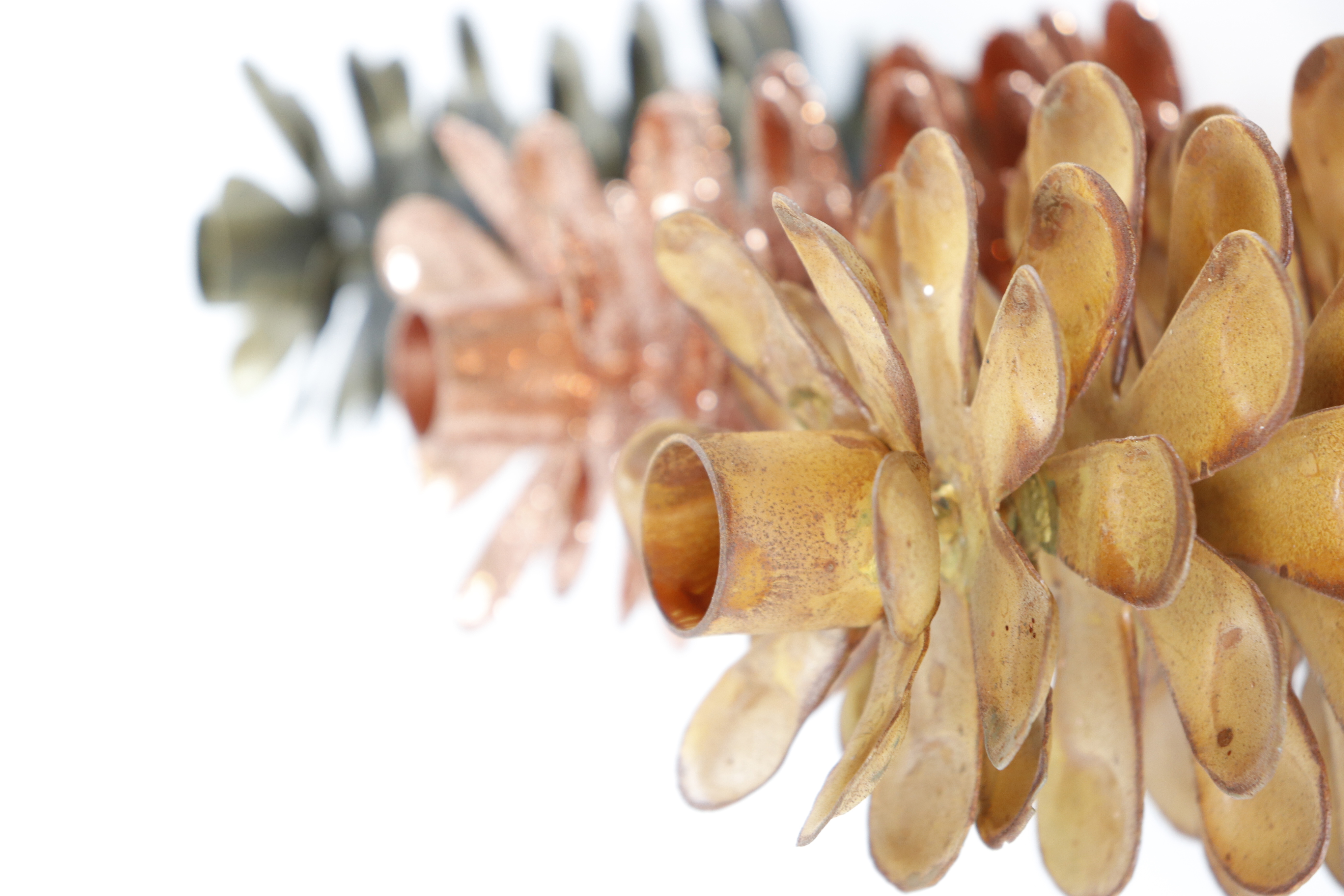 Le set comprend trois chandeliers au design individuel, qui ont la forme de pommes de pin. Chaque exemplaire est fabriqué en métal de haute qualité et mesure environ 15 cm, ce qui les rend pratiques et polyvalents en termes de placement. Vous pouvez placer ces chandeliers sur une table d'appoint, sur le rebord d'une fenêtre, sur le manteau d'une cheminée ou dans une bibliothèque et vous verrez comment ils apportent immédiatement une touche de charme.