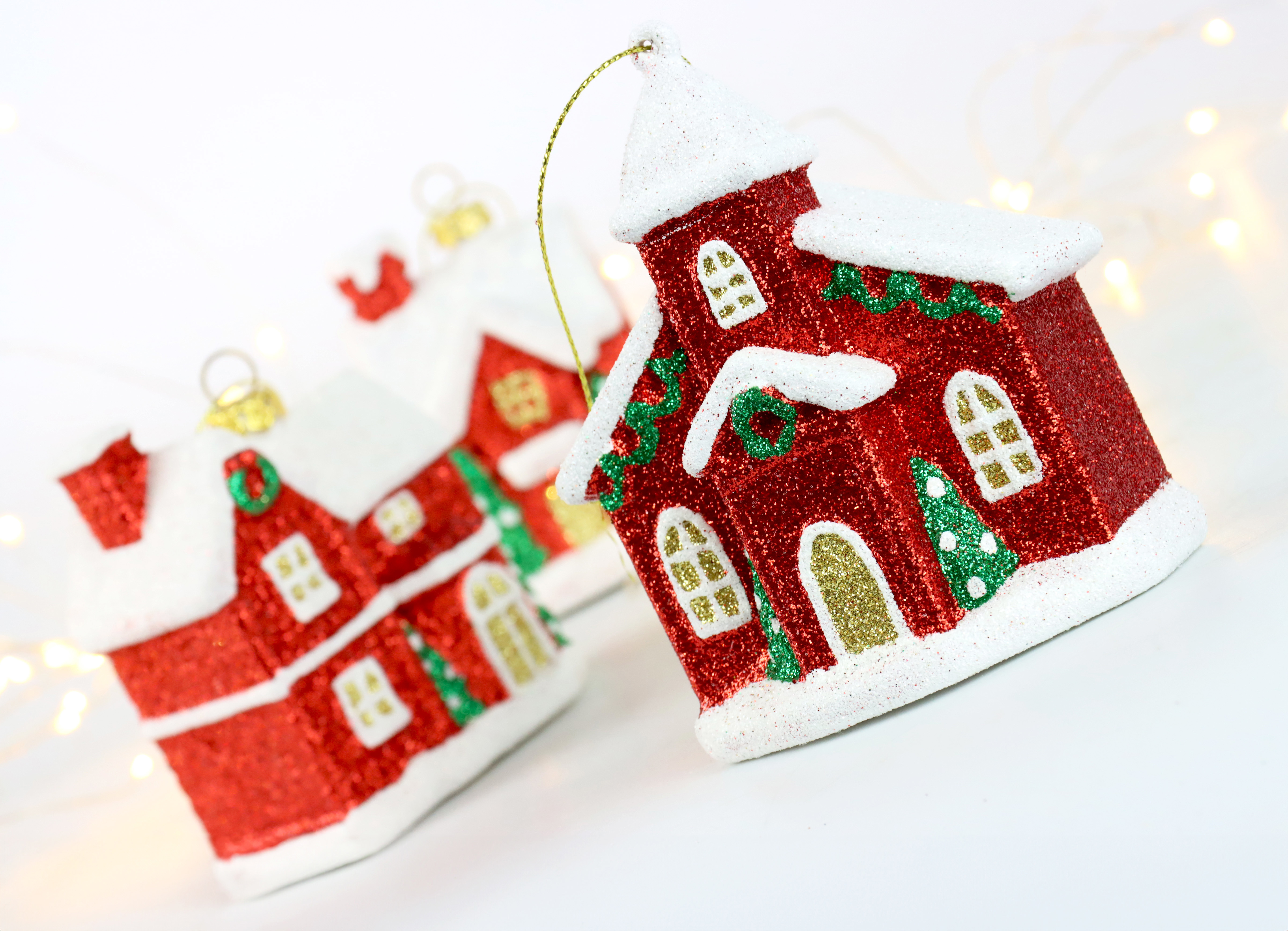Parole chiave: ornamenti decorativi "case", decorazione natalizia, set di 3, plastica di alta qualità, glitter, idea regalo, casa e lifestyle, Natale, vendita al dettaglio.
